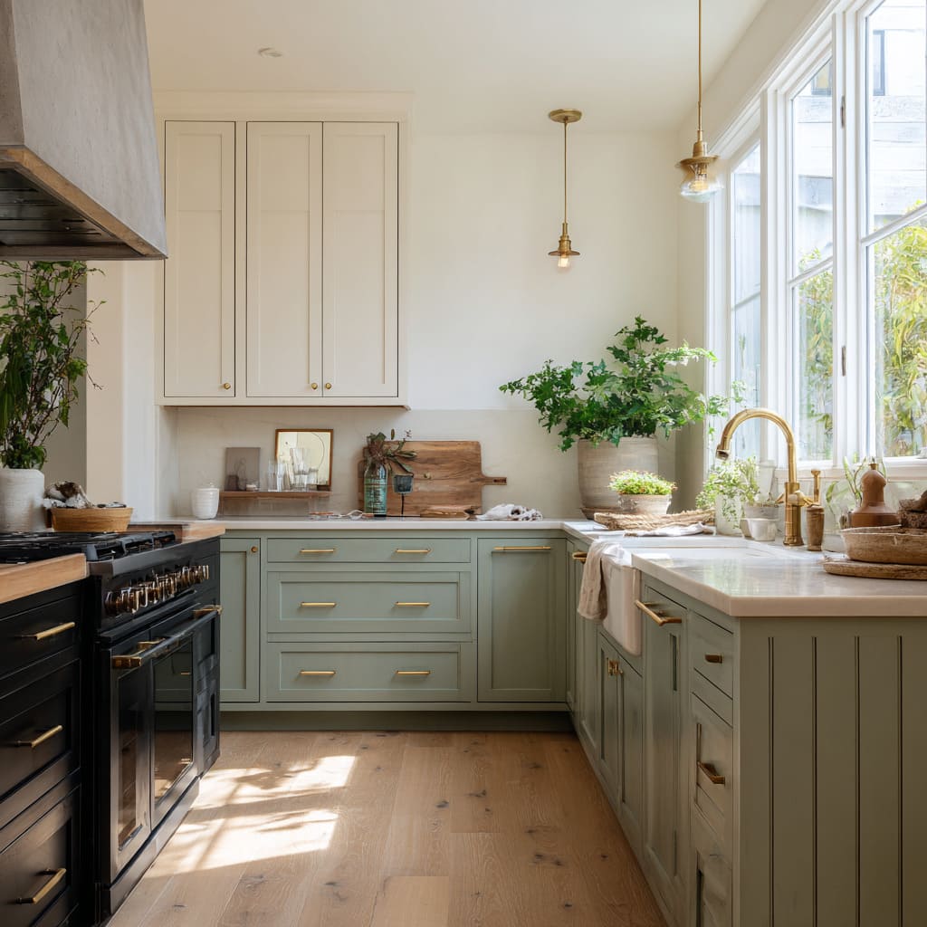 The calm versions (for example, sage + cream, greige + walnut, warm white + charcoal) work because the split line stays consistent and the cabinet profiles stay consistent. When the door style and proportions repeat, the brain registers one cabinet family with two values, not two unrelated installations stacked together.