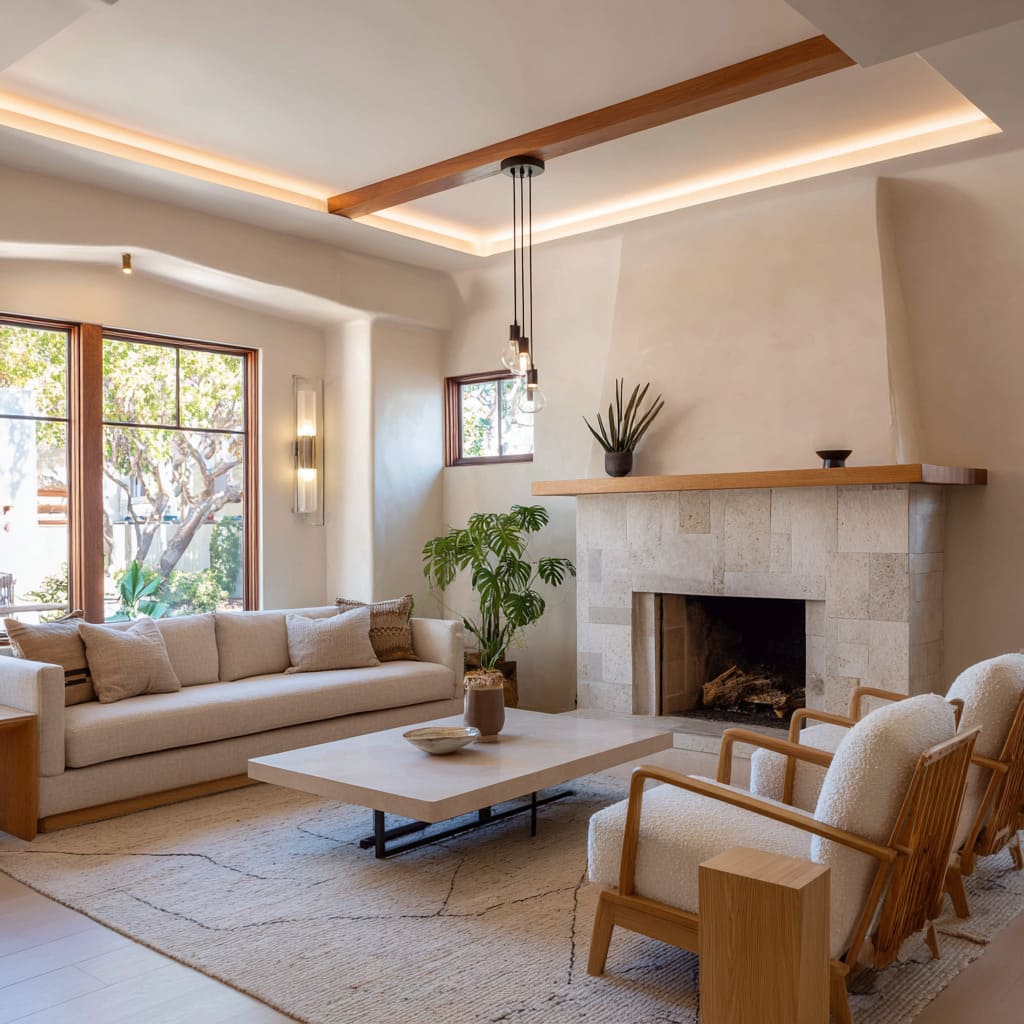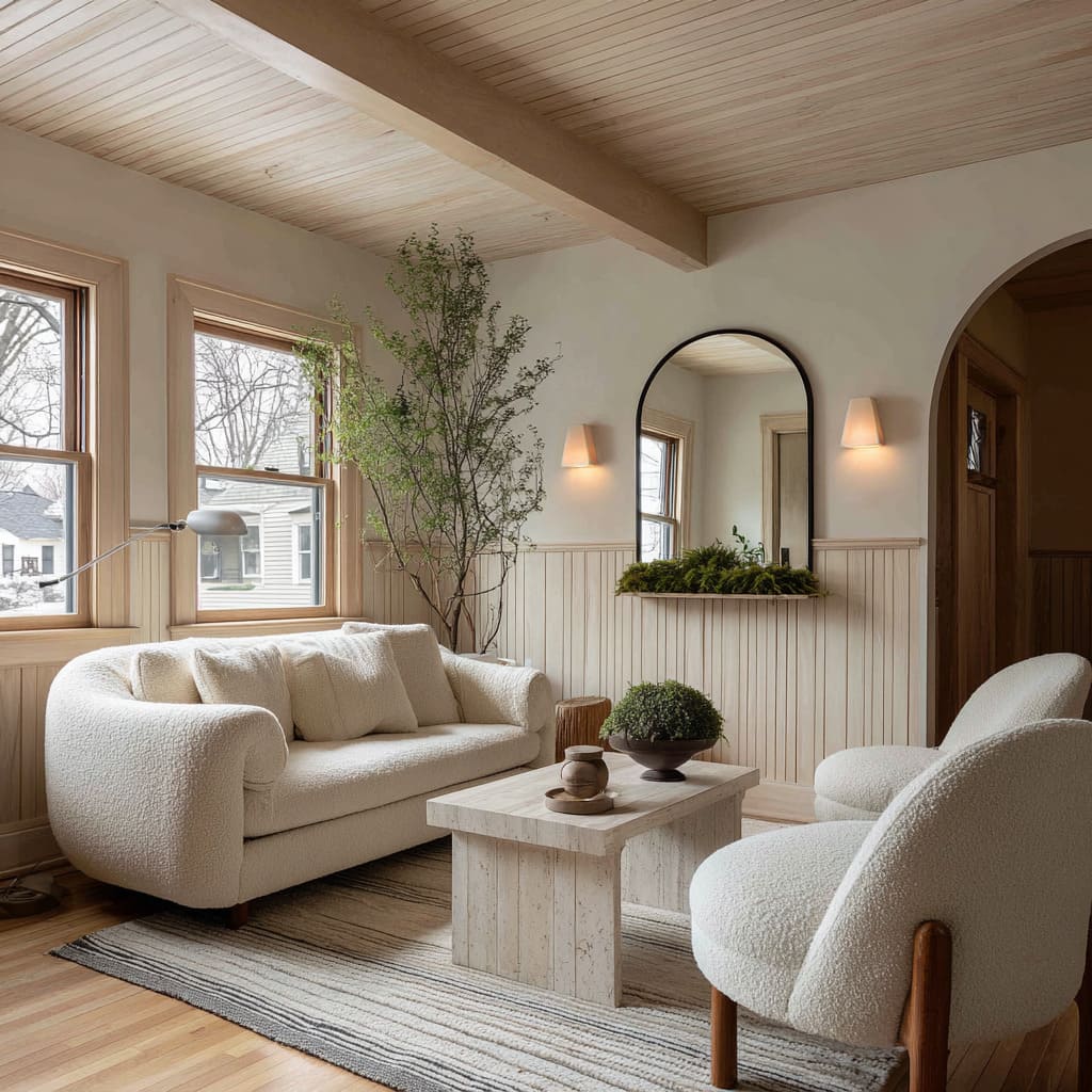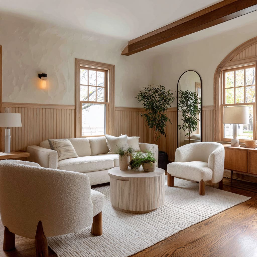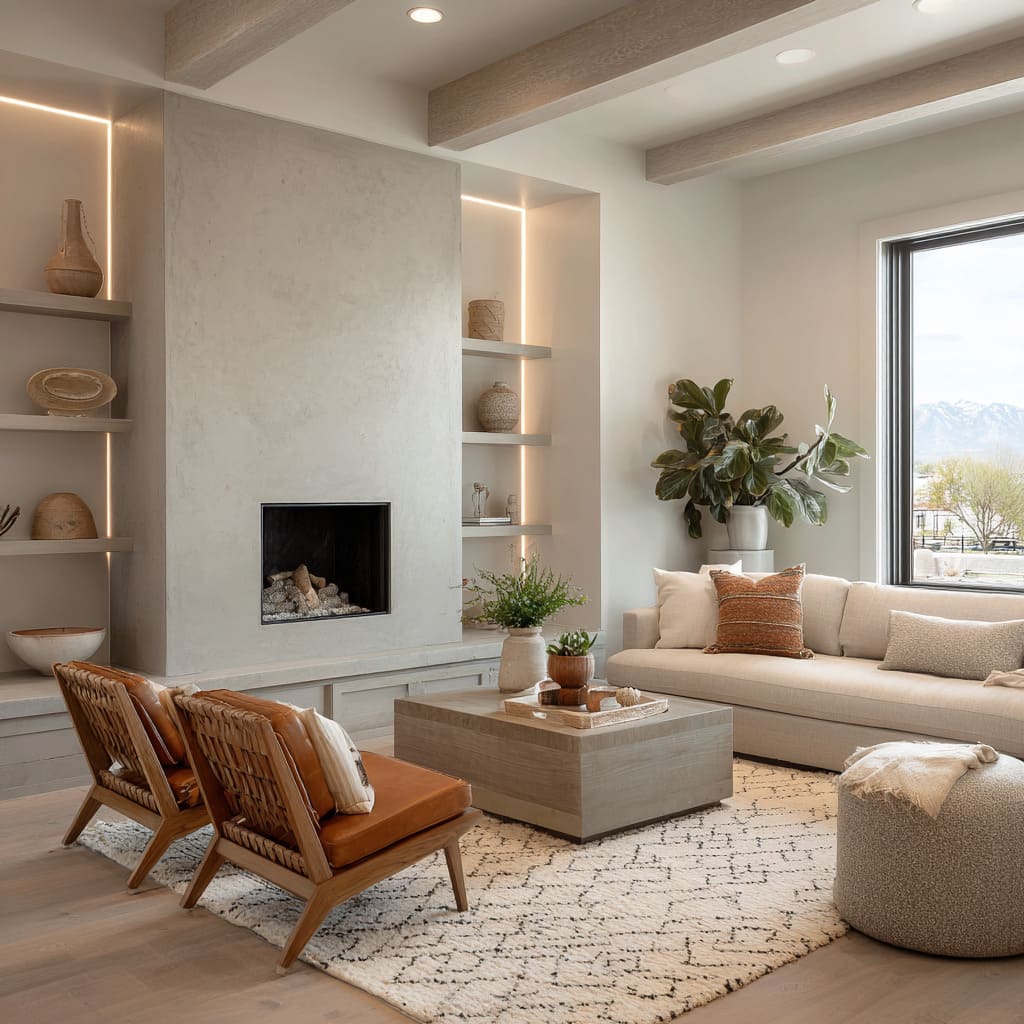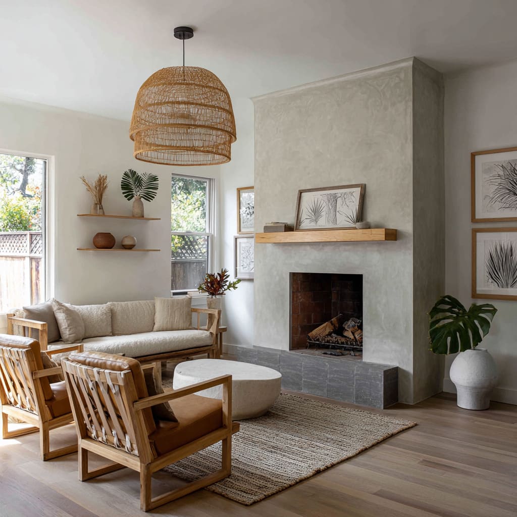 • Deliberate asymmetry. Side tables that don’t match, lighting hung slightly off-axis, or a lone ottoman placed just left of center—these slight shifts give balance a relaxed tone.