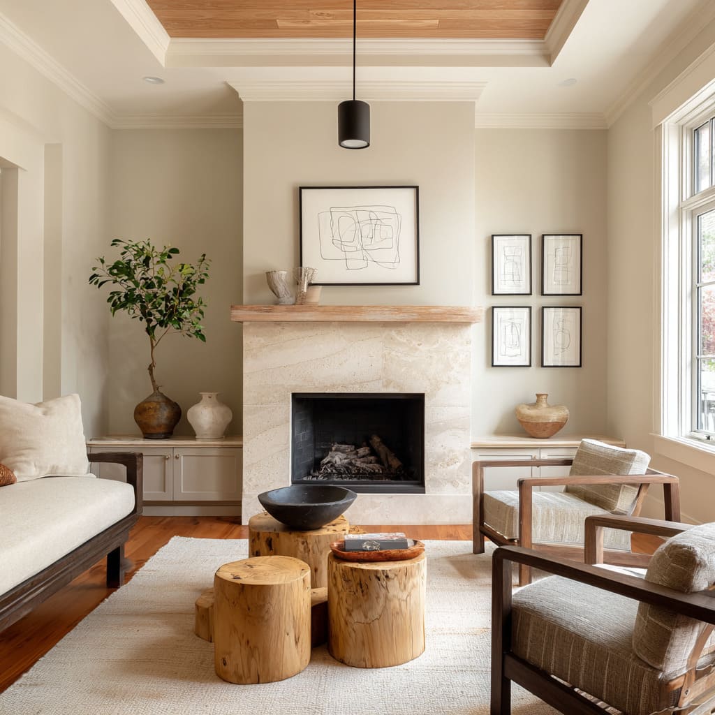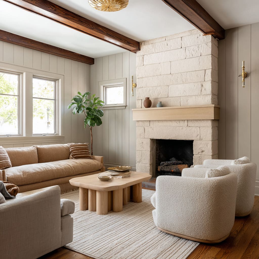 The fireplace is clad in a cream-toned natural stone with soft linear veining