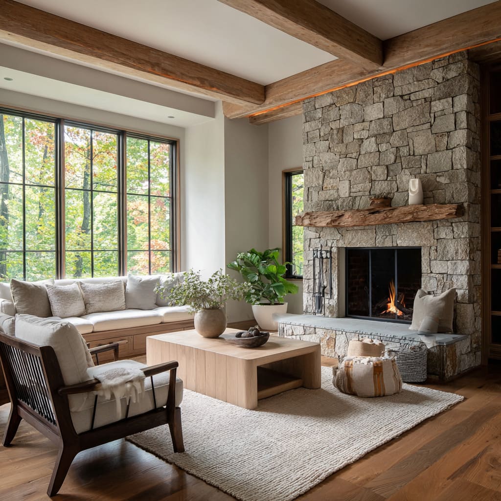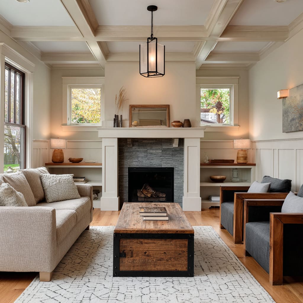 In many craftsman style living room ideas, the ceiling doesn’t fade into the background—it actively shapes how the room feels. While walls and floors ground the space, the ceiling helps define its volume, guiding how the weight of heavier elements—like stone fireplaces or solid mantels—sits within the room.