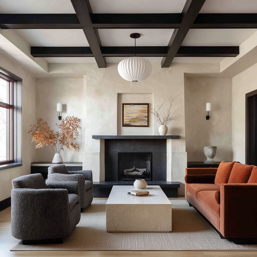 The finish of the beams or ceiling treatment changes how grounded the room feels. Deep-stained beams give the top plane a sense of gravity, almost like a frame that holds the composition together.