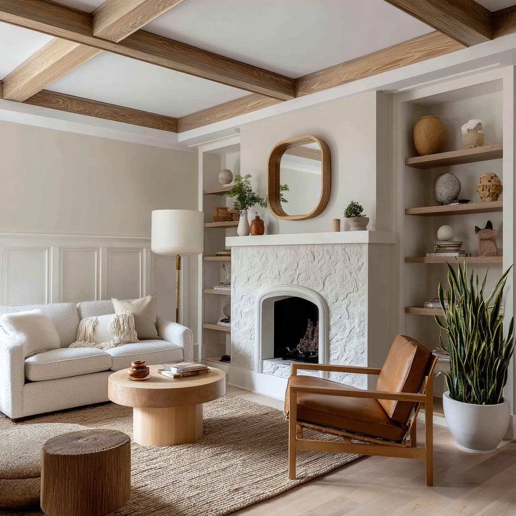 In contrast, pale-washed or lightly bleached tones reflect light and visually lift the ceiling, allowing heavier pieces below—like stone surrounds or dense upholstery—to sit without dragging the atmosphere downward. This is where ceiling work becomes more than a historical nod.