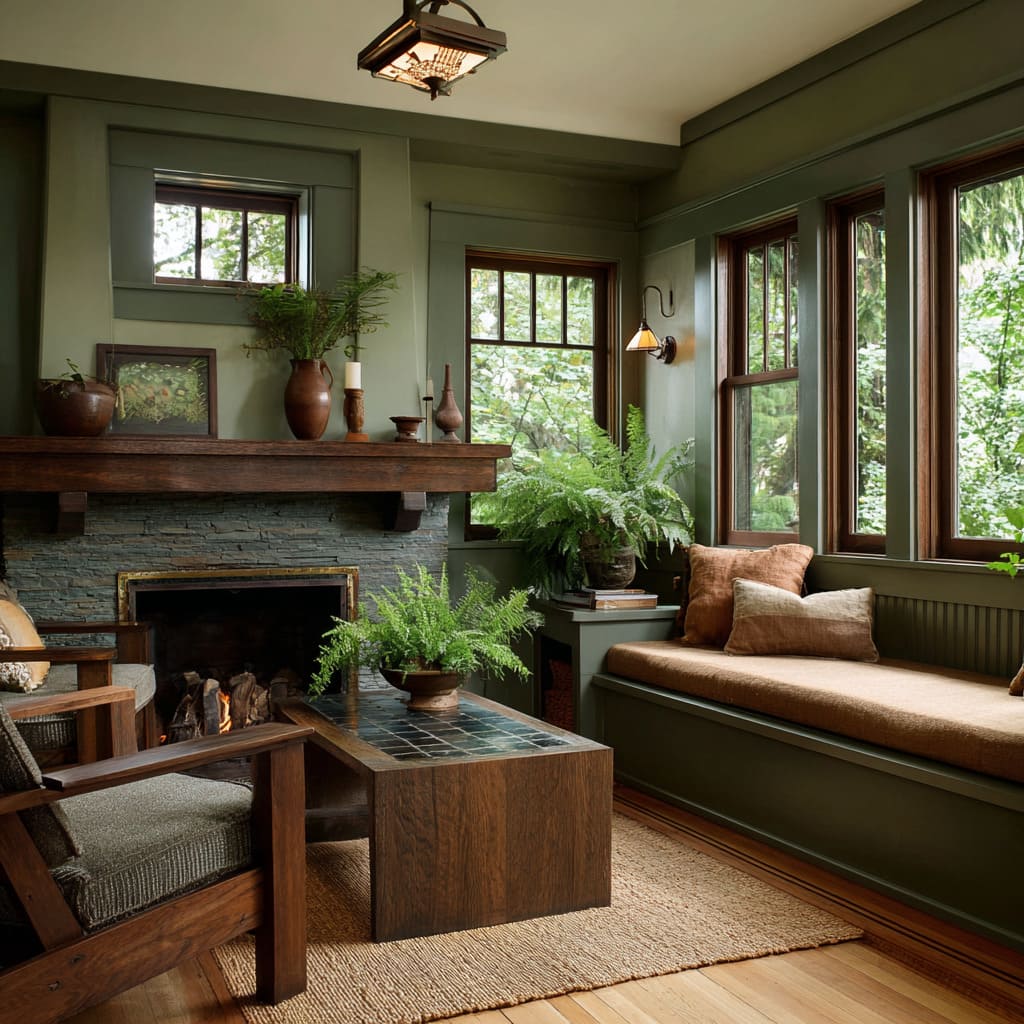 The warm olive wall color paired with a soft green tile fireplace surround immediately grounds the eye and quiets the palette