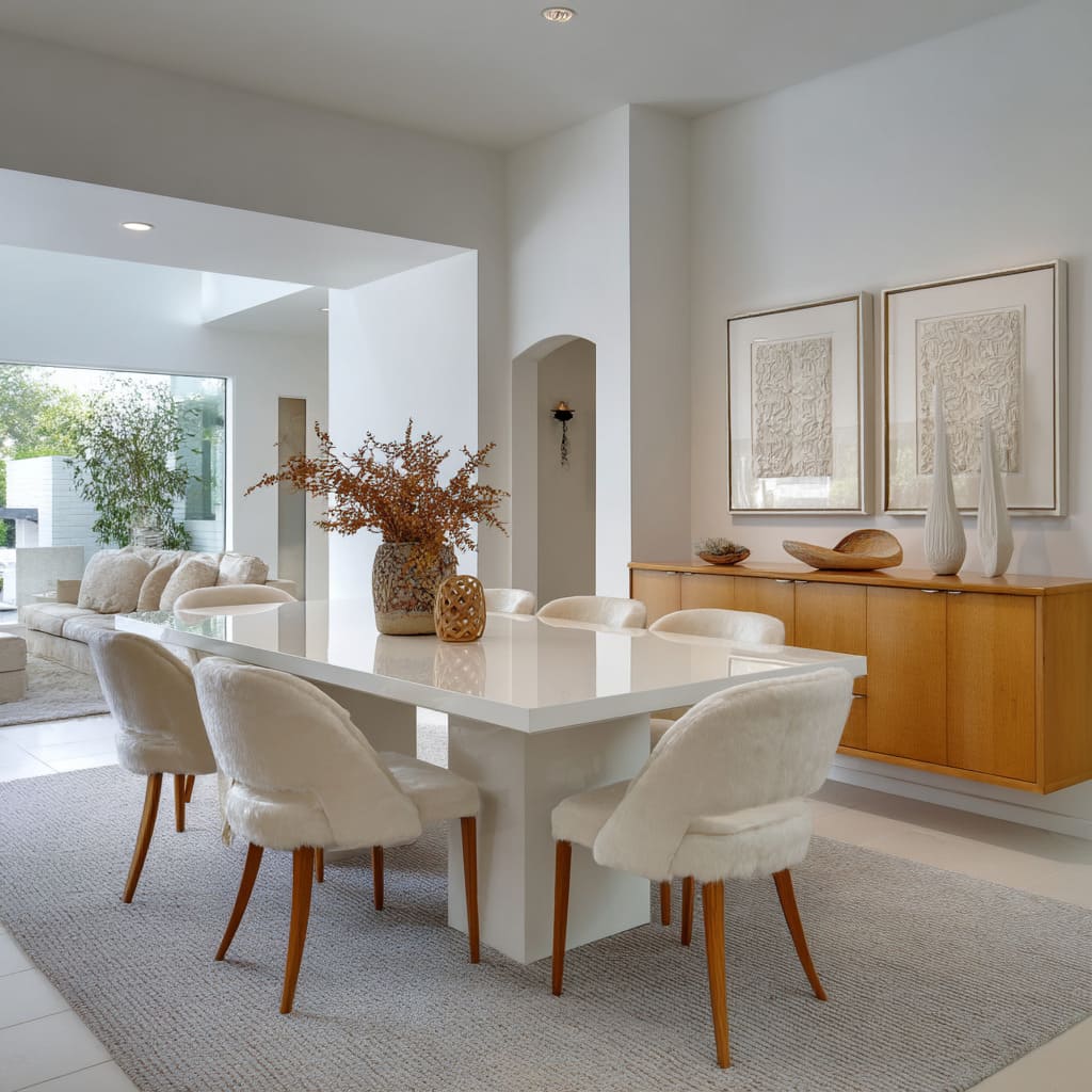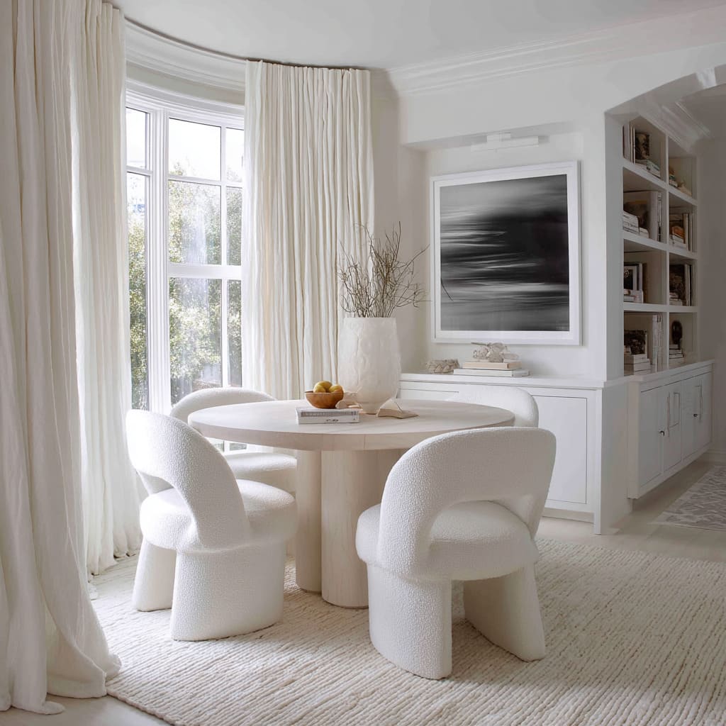 White dining rooms continue to stand out—not because they demand attention, but because they leave space for nuance. In a setting built around restraint, every surface becomes more expressive: a ripple in fabric, the curve of a table leg, the shift in gloss from matte to polished.