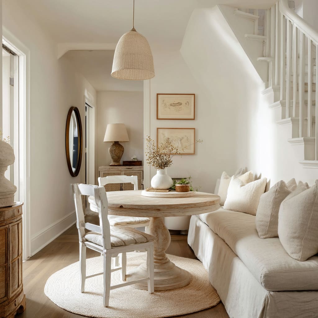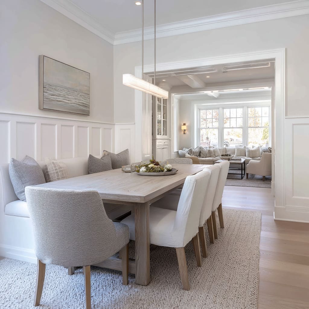 In many white dining rooms, storage isn’t something added—it’s something absorbed into the architecture. Built-in banquettes, shelving, and cabinetry are often painted in the exact same tone as the surrounding wall.