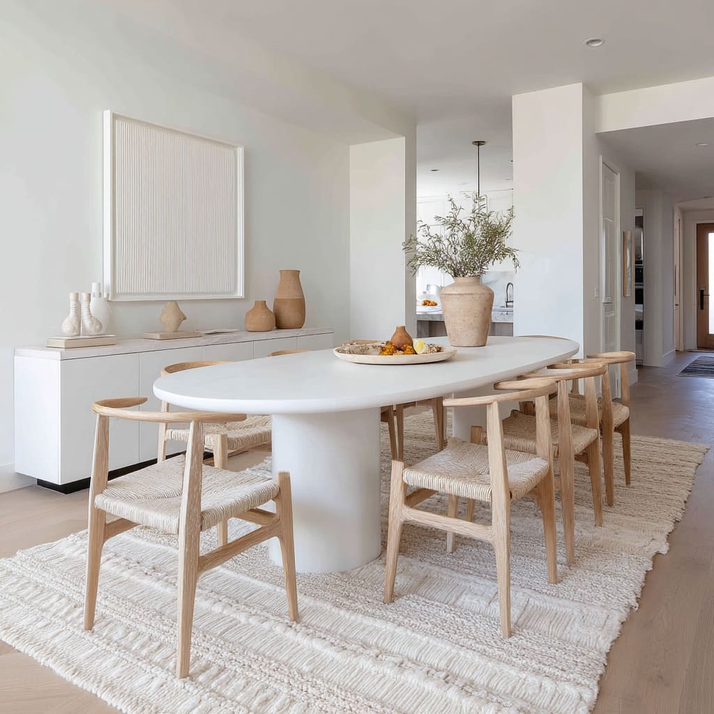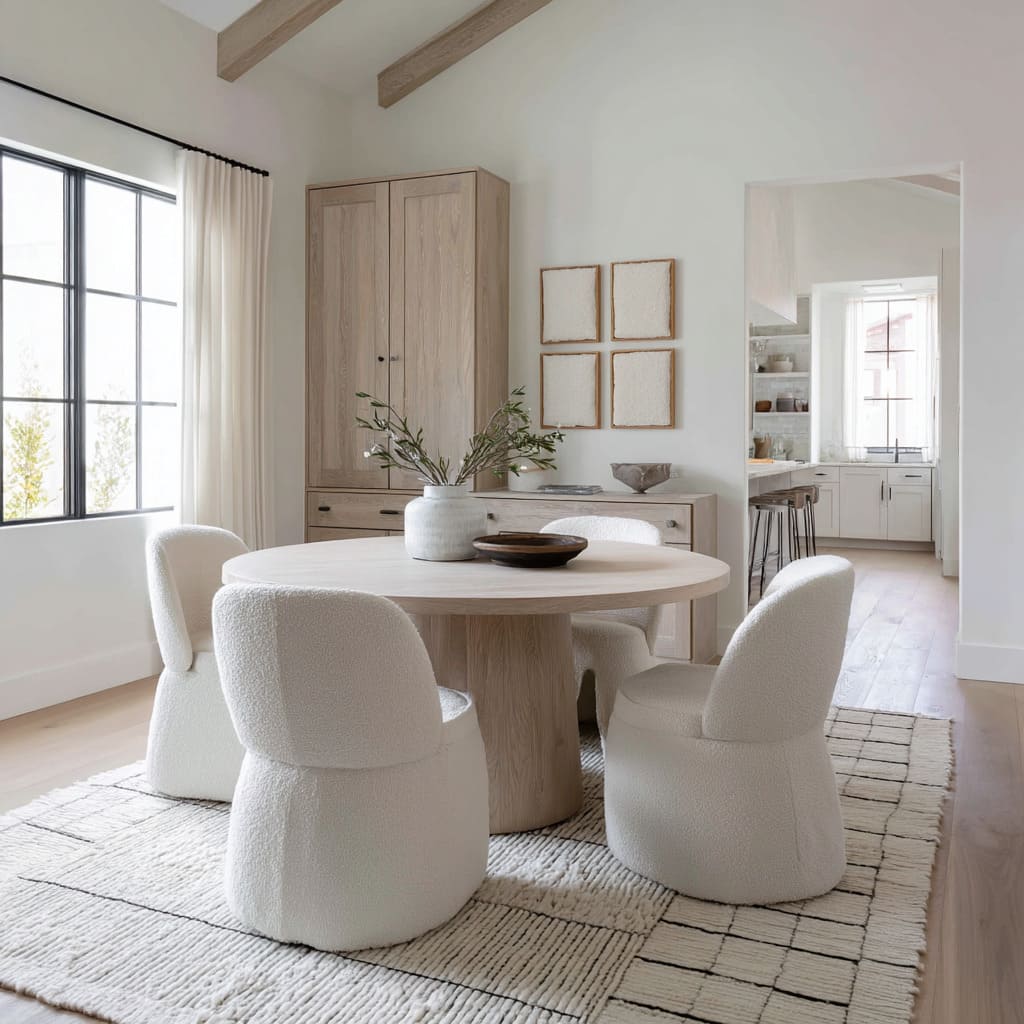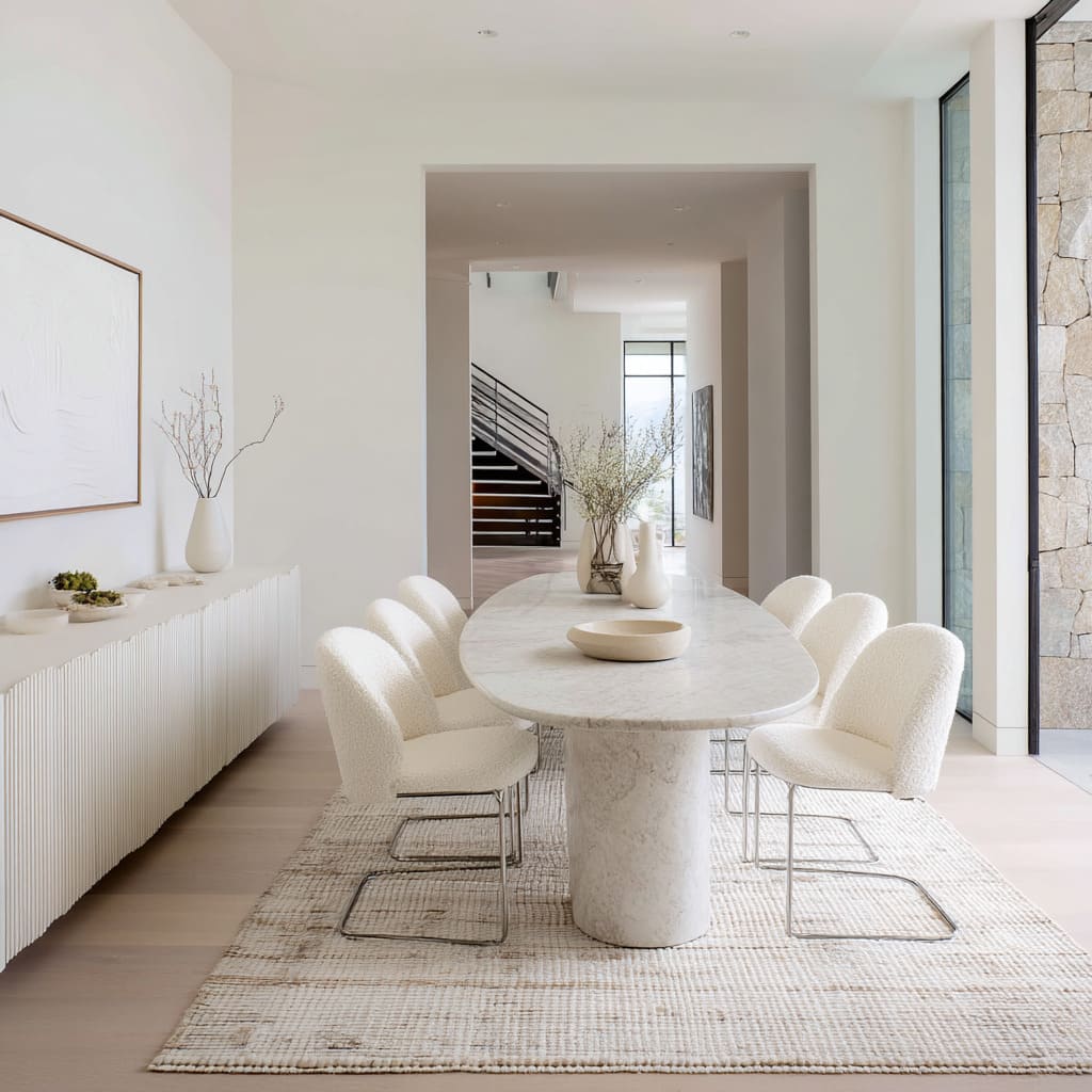 These materials hold the visual weight of the furniture and absorb shadows, grounding the design without needing color. This method of layering textures from ceiling to floor can be seen across many current dining room ideas in white, where visual interest comes not from pattern or pigment but from contrast between smooth, soft, and coarse finishes.