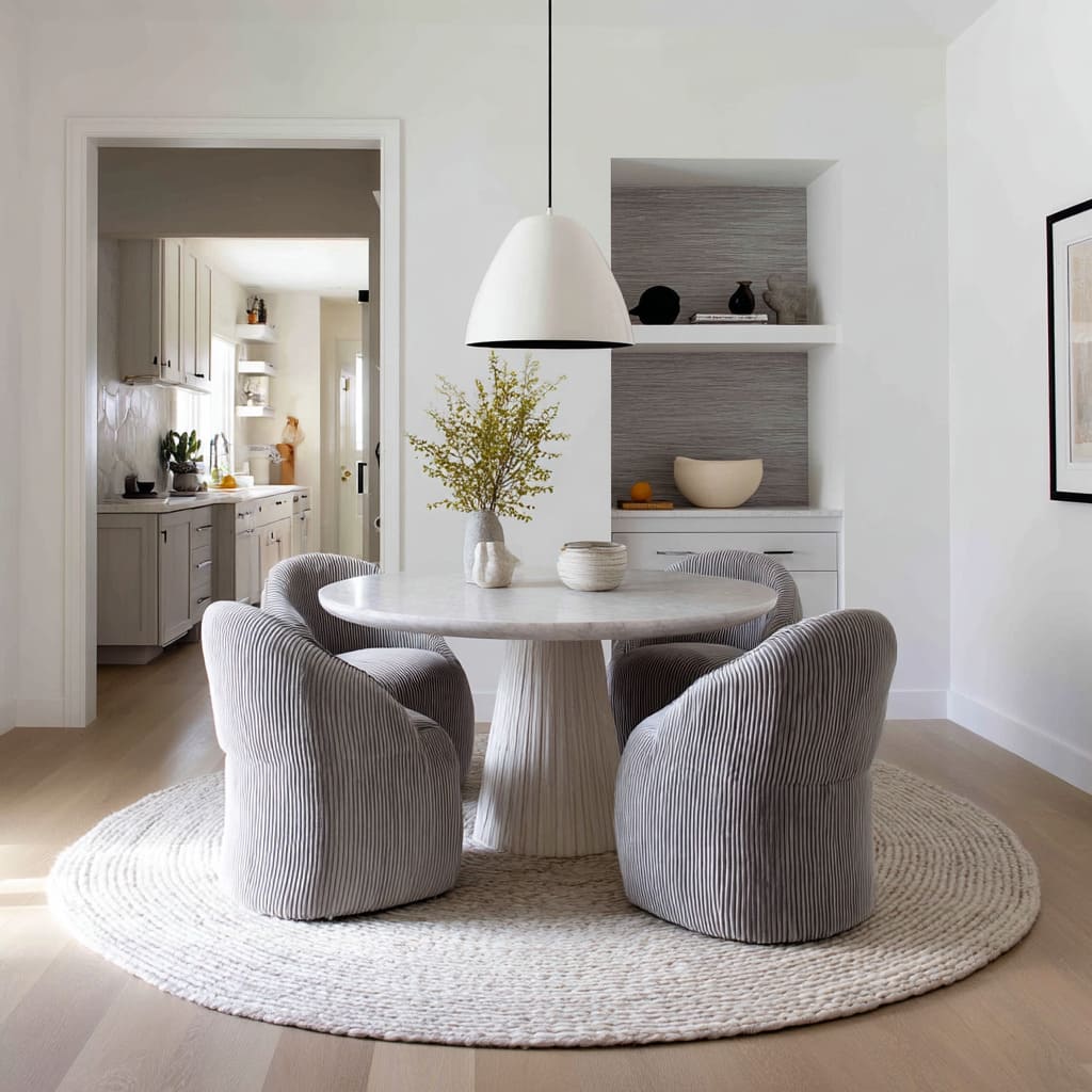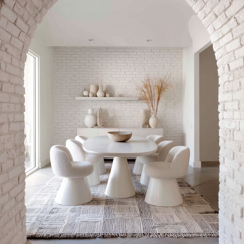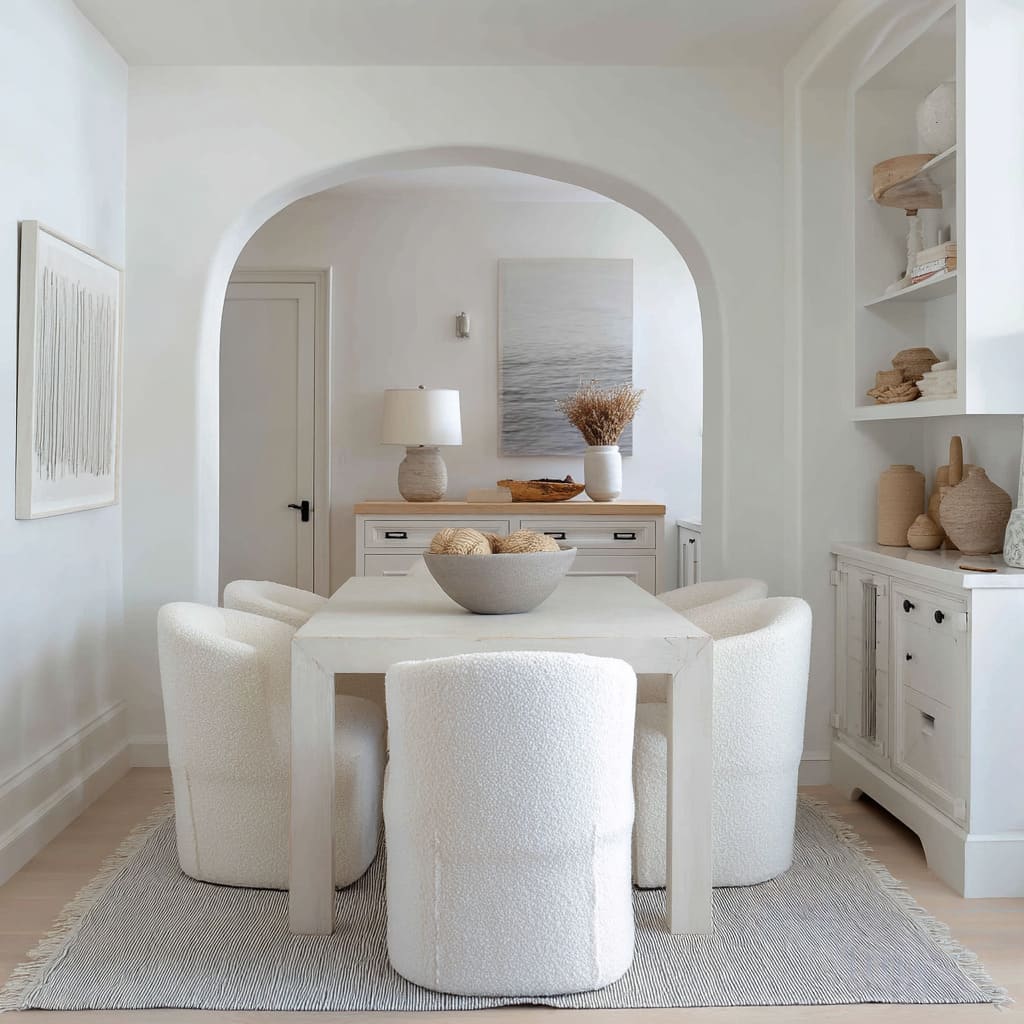 The rhythm created by these repeated grooves offers the space a kind of quiet heartbeat. Even in all white dining room ideas, this pattern of curve versus line is enough to shape movement through the space.