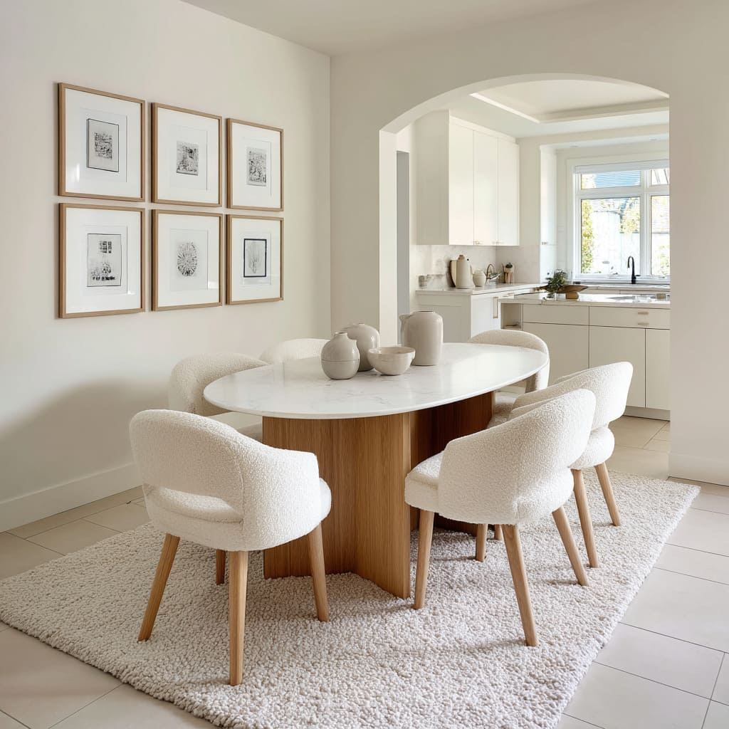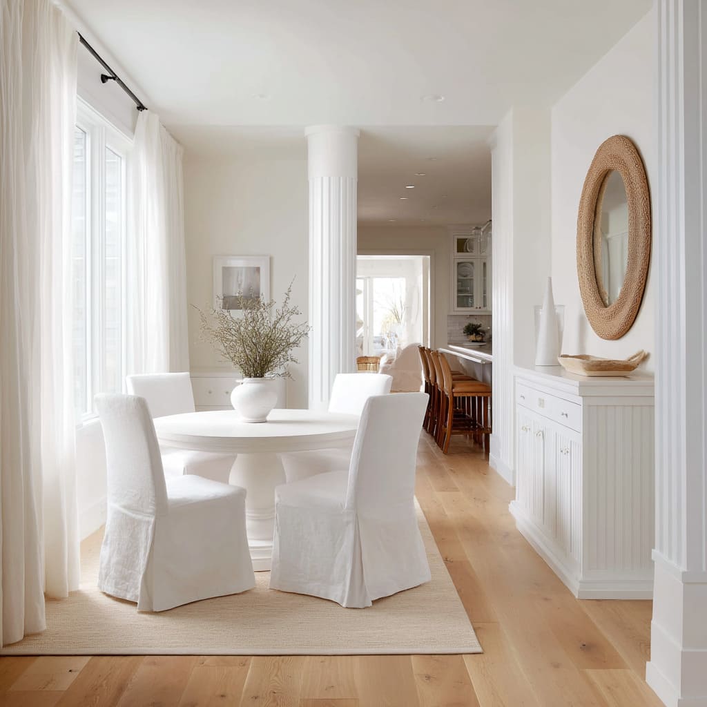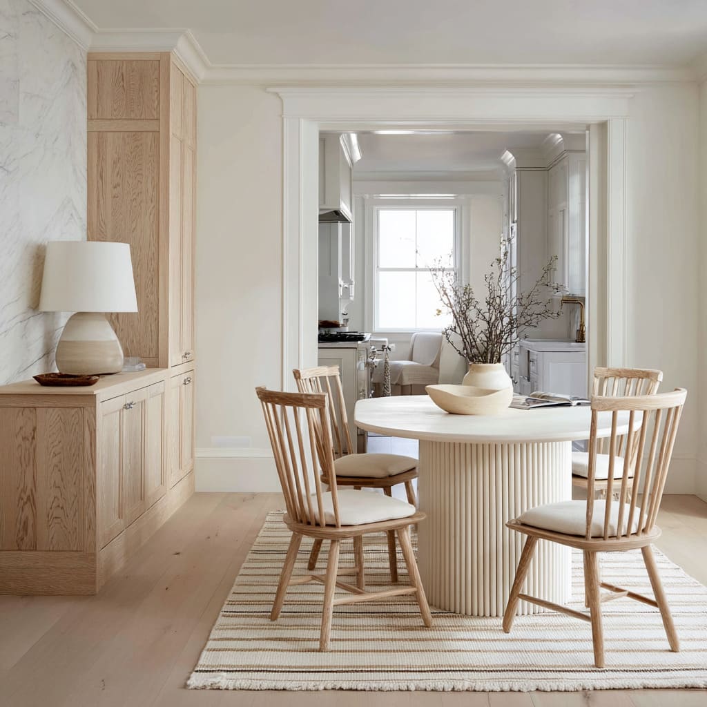 The rhythm created by these repeated grooves offers the space a kind of quiet heartbeat. Even in all white dining room ideas, this pattern of curve versus line is enough to shape movement through the space.