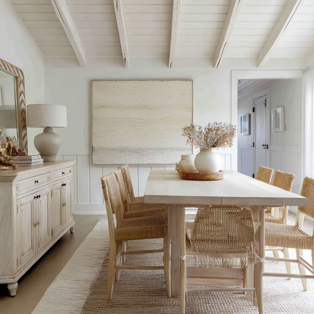White dining room compositions rarely depend on strong color shifts to create interest. Instead, depth is developed through texture, arranged vertically in a way that subtly guides the eye.