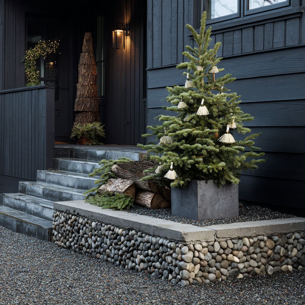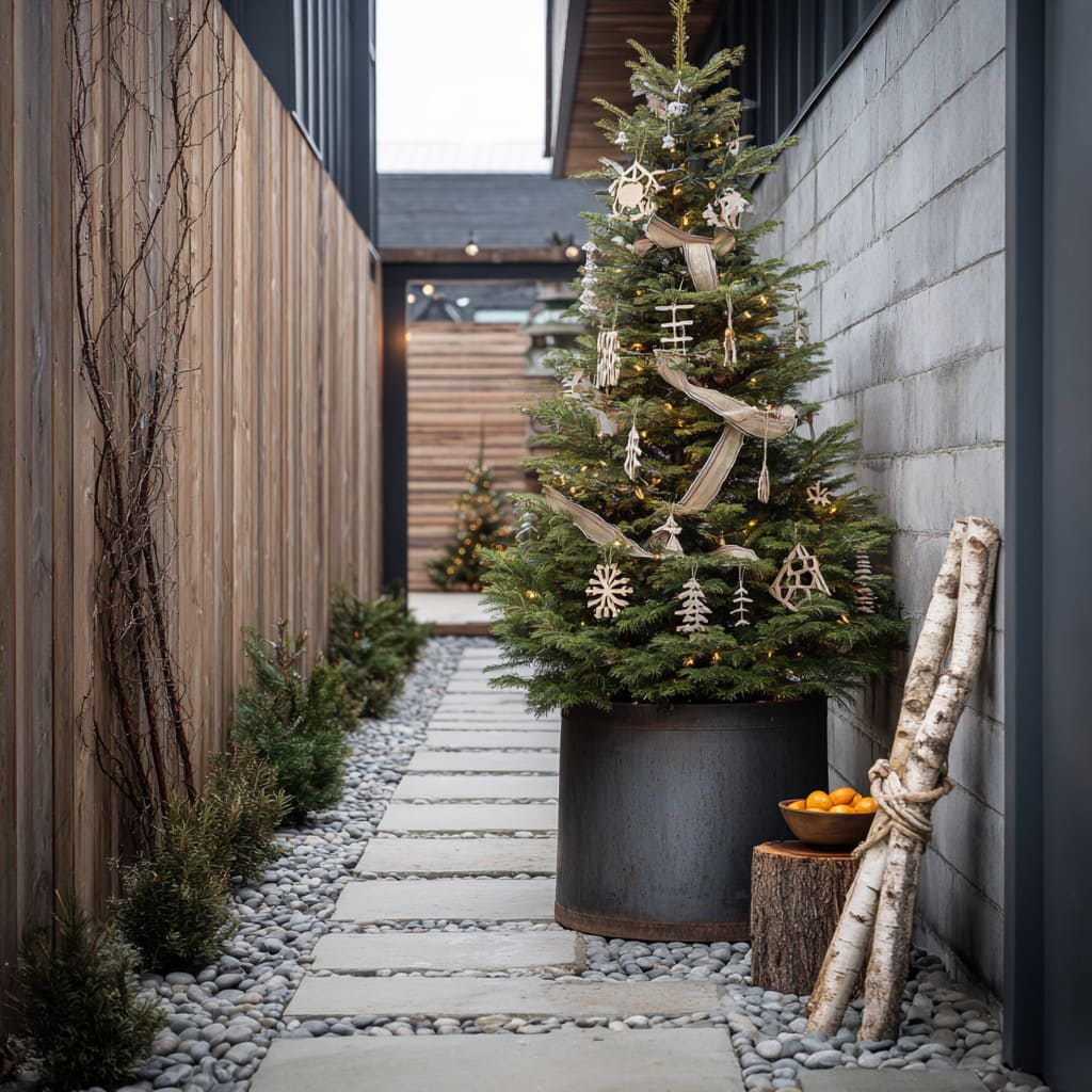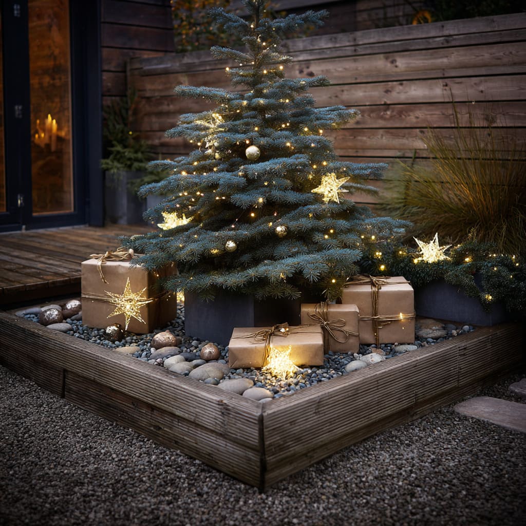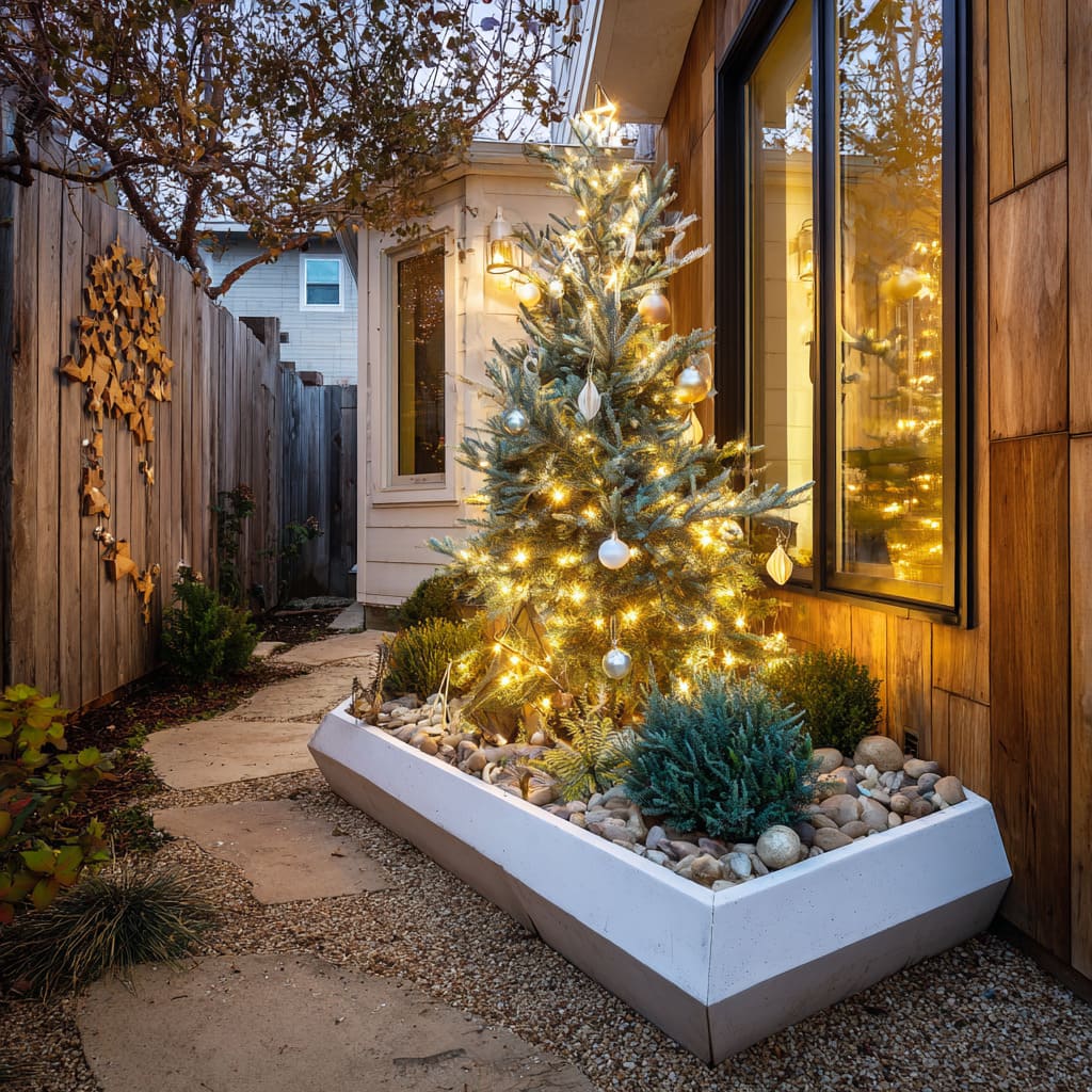 La colocación cuidada de pequeños elementos de apoyo aporta estructura al conjunto. En lugar de rellenar espacio, estas ideas de árboles navideños al aire libre llevan la mirada de punto en punto con señales sutiles.
