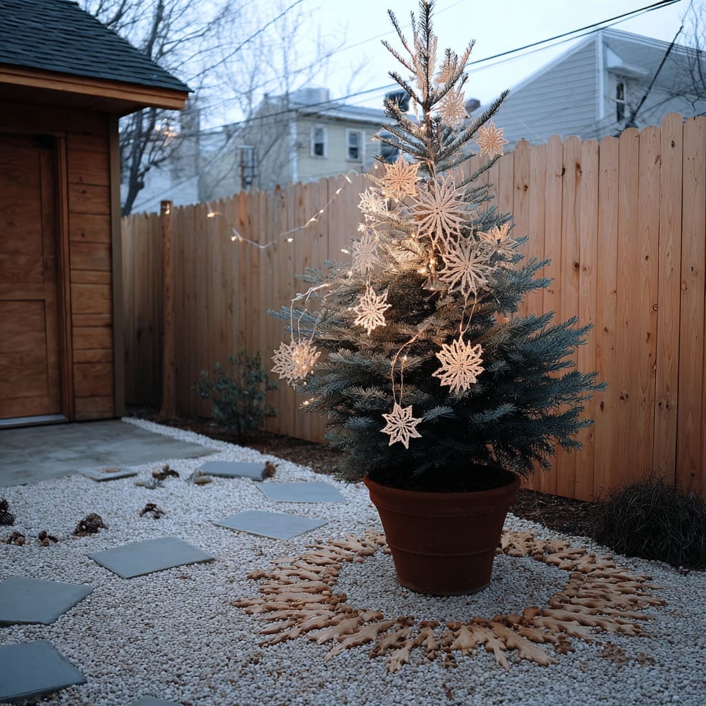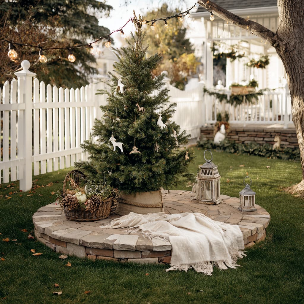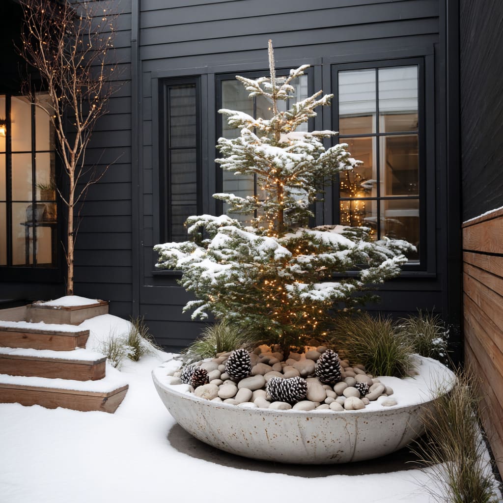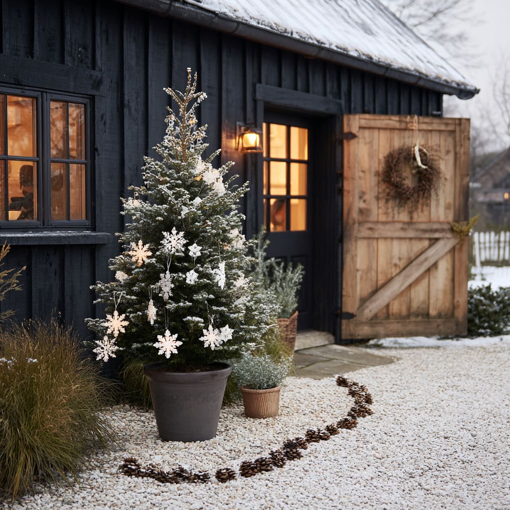 La colocación cuidada de pequeños elementos de apoyo aporta estructura al conjunto. En lugar de rellenar espacio, estas ideas de árboles navideños al aire libre llevan la mirada de punto en punto con señales sutiles.