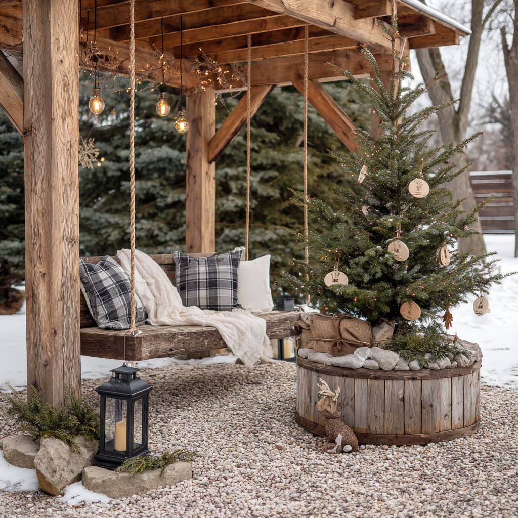 Un árbol festivo en una maceta rústica tipo barril se coloca junto a un banco colgante de madera suspendido con cuerdas gruesas.