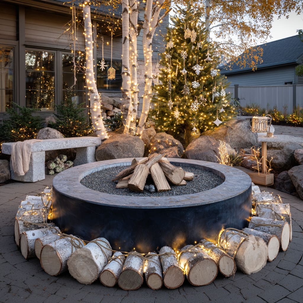 Un ejemplar caducifolio desnudo, espolvoreado de nieve y envuelto en luces, puede convertirse en la pieza principal—su ramificación funciona como escultura estacional. En otro esquema, una hoguera rodeada de troncos de abedul iluminados convierte el calor del entorno en el ancla, mientras el árbol navideño desempeña un papel de apoyo más silencioso.