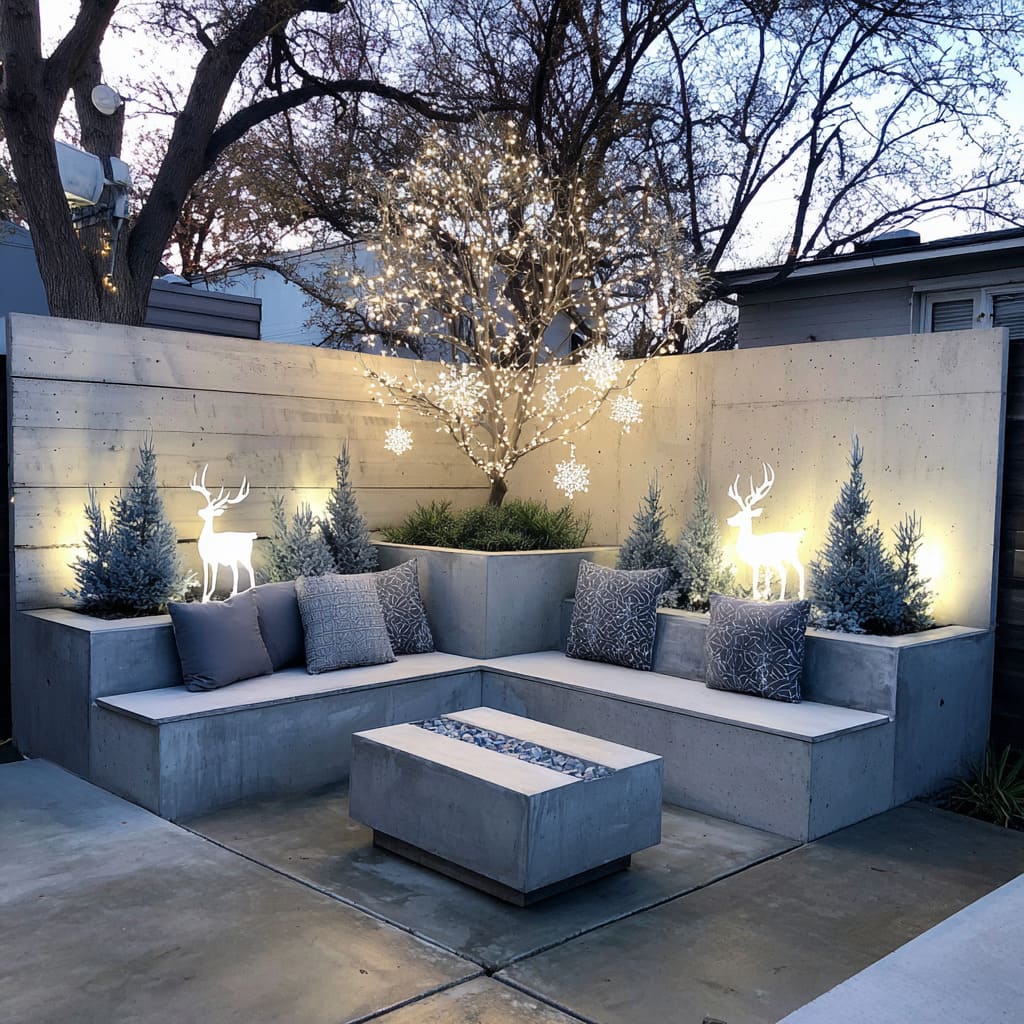 Incluso un conjunto de pinos bajos escarchados junto a un banco empotrado puede transmitir la atmósfera con más fuerza que un árbol alto ornamentado. Estos desplazamientos crean un escenario más amplio—uno en el que el árbol deja de acaparar cada mirada y se integra en un espacio estratificado lleno de ritmo, contraste y variación.