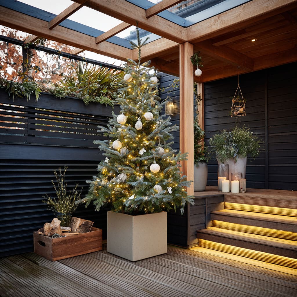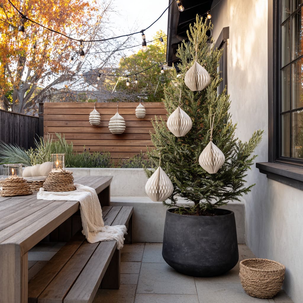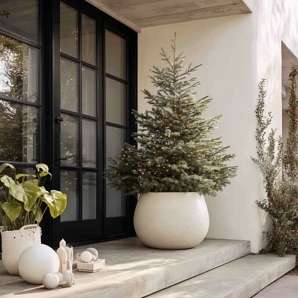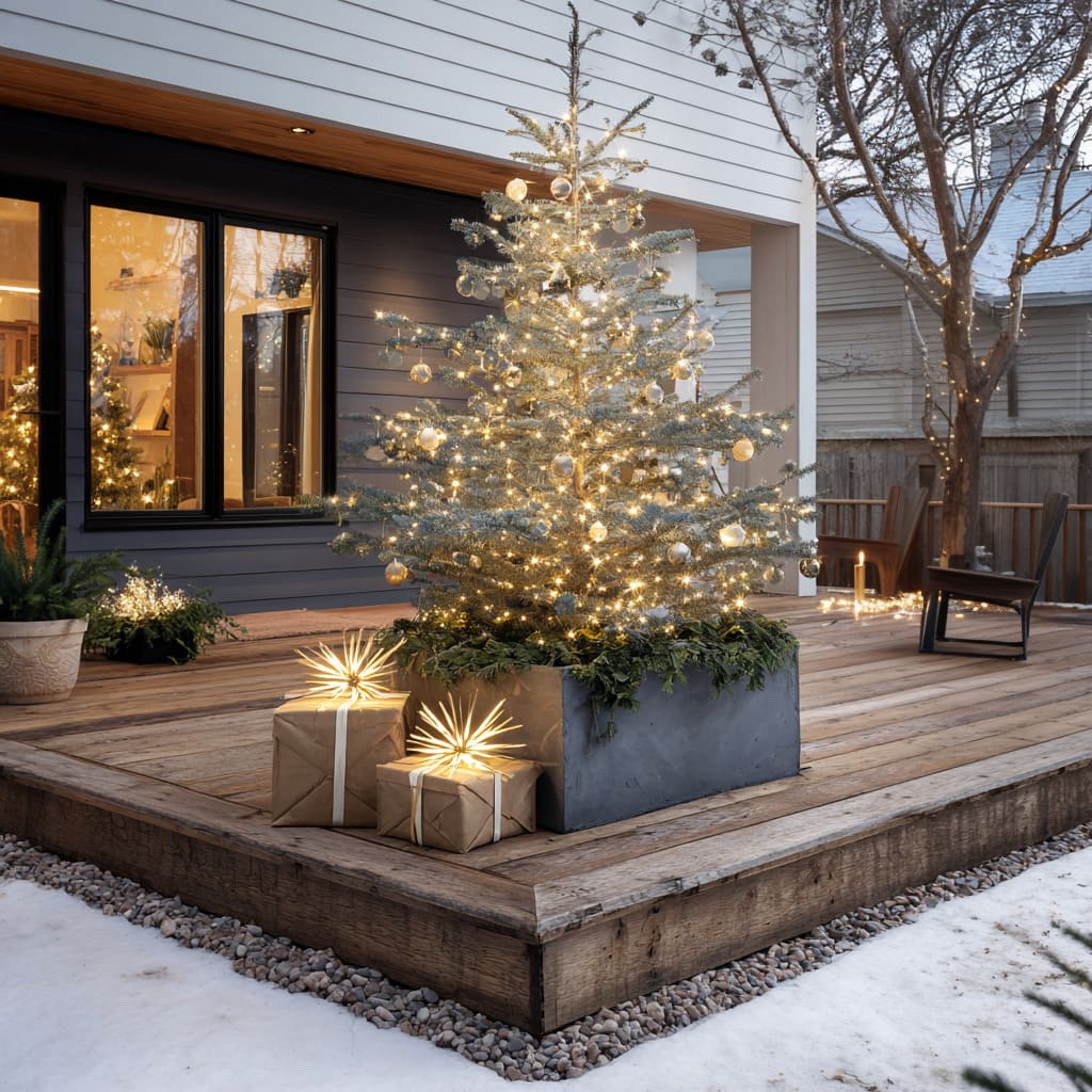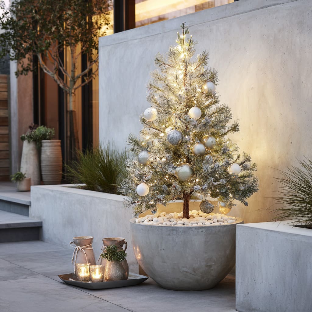 Los montajes modernos al aire libre prestan gran atención a lo que rodea al árbol: el mobiliario, la iluminación e incluso el material del suelo. Detalles como una sola cinta, un suave racimo de adornos artesanales o la curva de una maceta suelen decir más que varias capas cargadas de brillo.