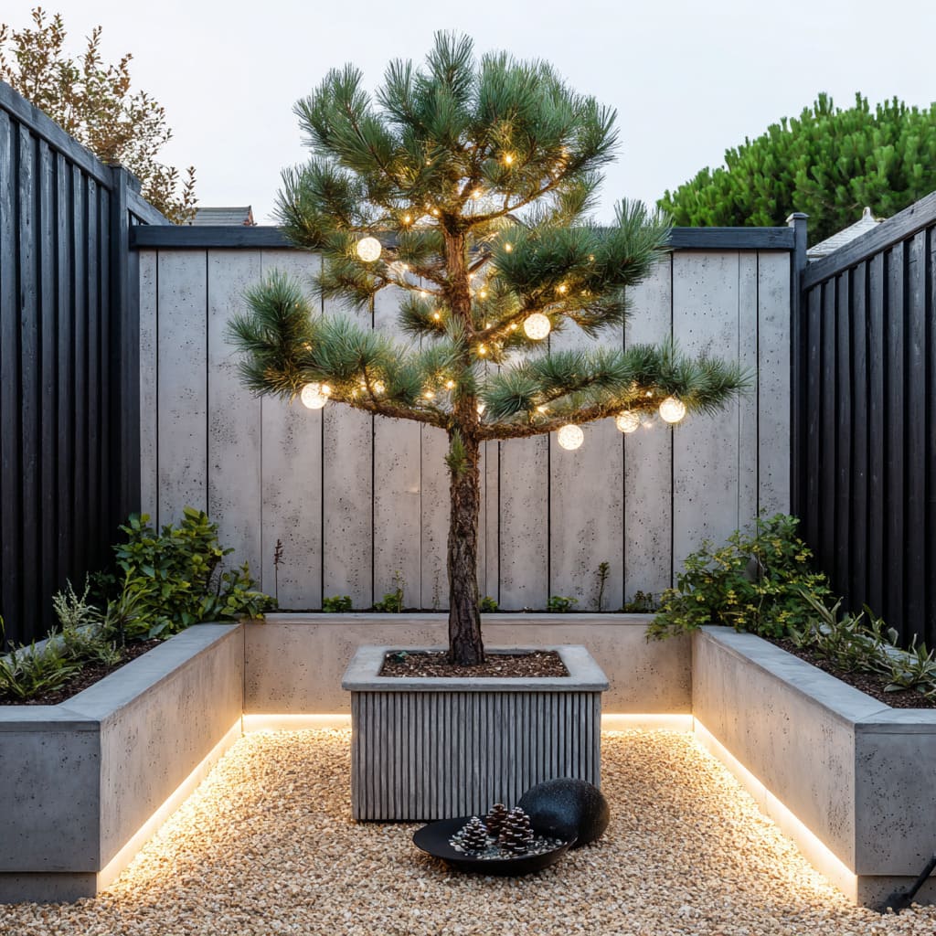 En muchas ideas modernas para decorar árboles al aire libre, es el espacio que rodea al árbol—no el árbol en sí—el que moldea el ambiente. En lugar de rellenar cada rama, estos diseños dejan espacio para que el conjunto respire.