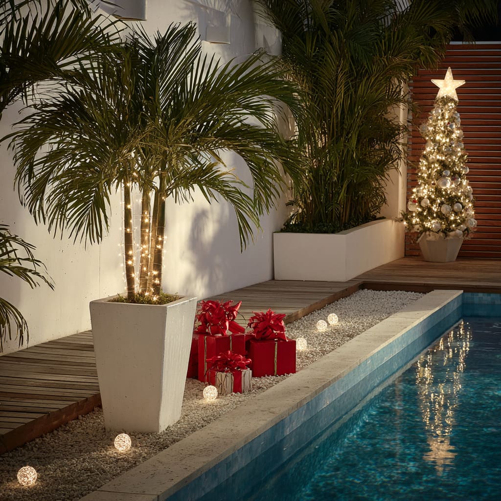 Navidad junto a la piscina entre palmeras, con un toque tropical y glamuroso.