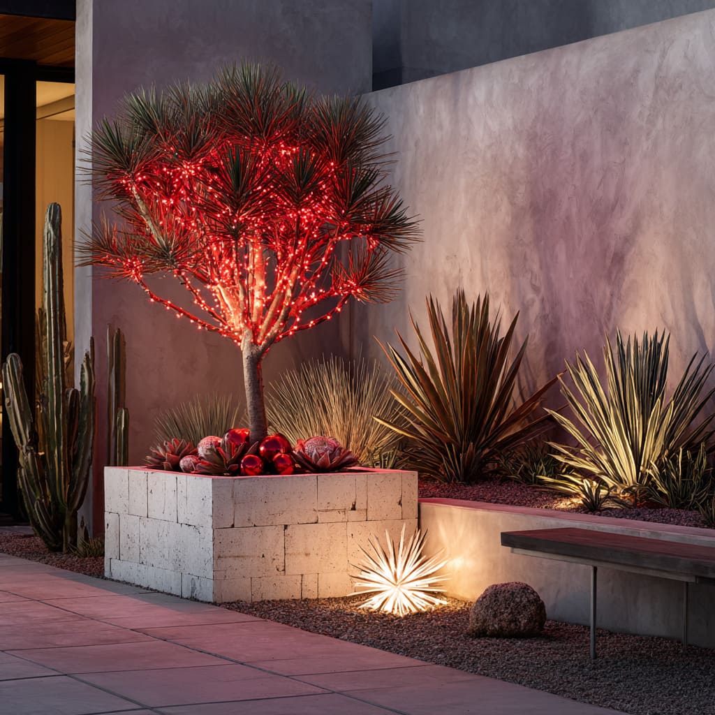 En algunos patios de inspiración desértica, las tiras LED rojas se enrollan firmemente en árboles verticales y escasos, llevando el follaje hacia una presencia más gráfica, casi ígnea. Este tratamiento no depende del exceso: se nutre de la estructura, del contraste y de la forma en que la luz talla la sombra.