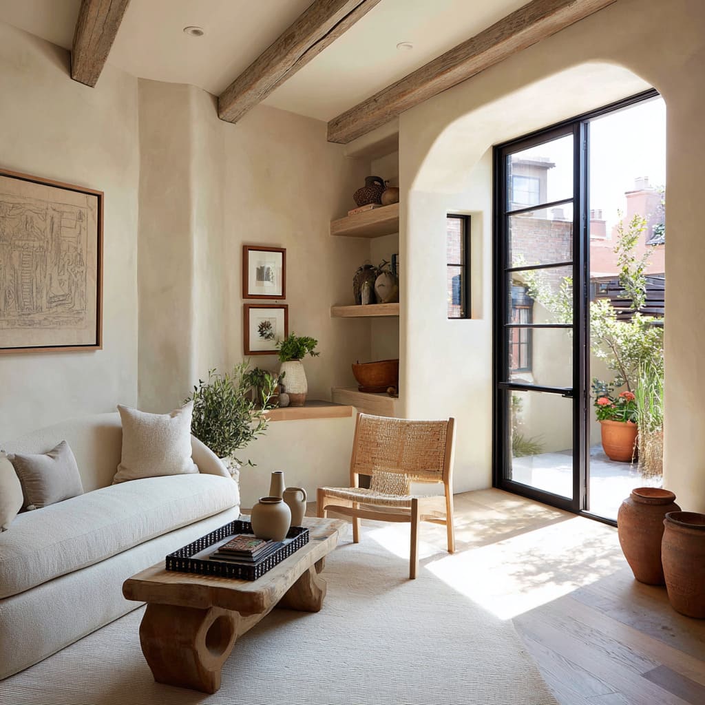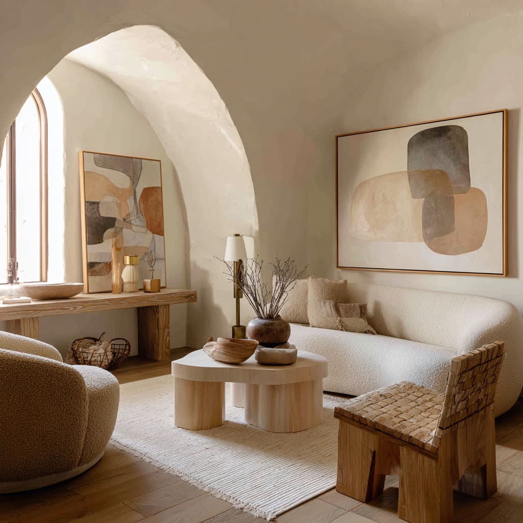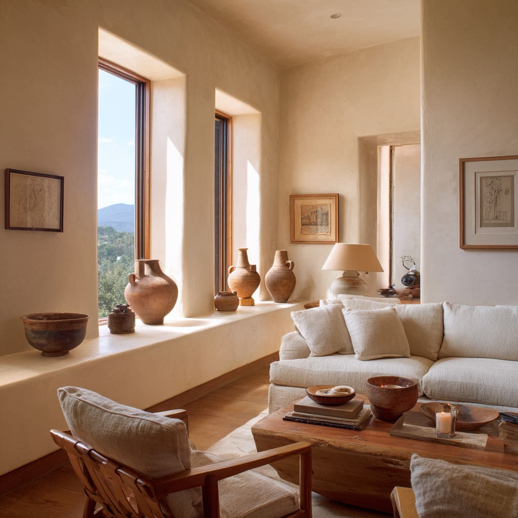 Los objetos hechos a mano tienen un papel clave en este enfoque decorativo, definiendo la atmósfera con sus texturas terrosas e imperfecciones suaves. Grandes vasijas de terracota, cuencos de madera tallada, piezas de barro con pátina y cerámicas rústicas aparecen con frecuencia, normalmente agrupadas de forma sencilla.