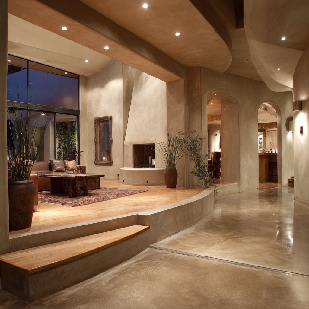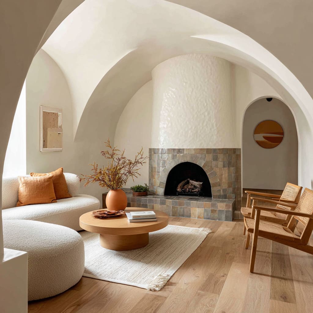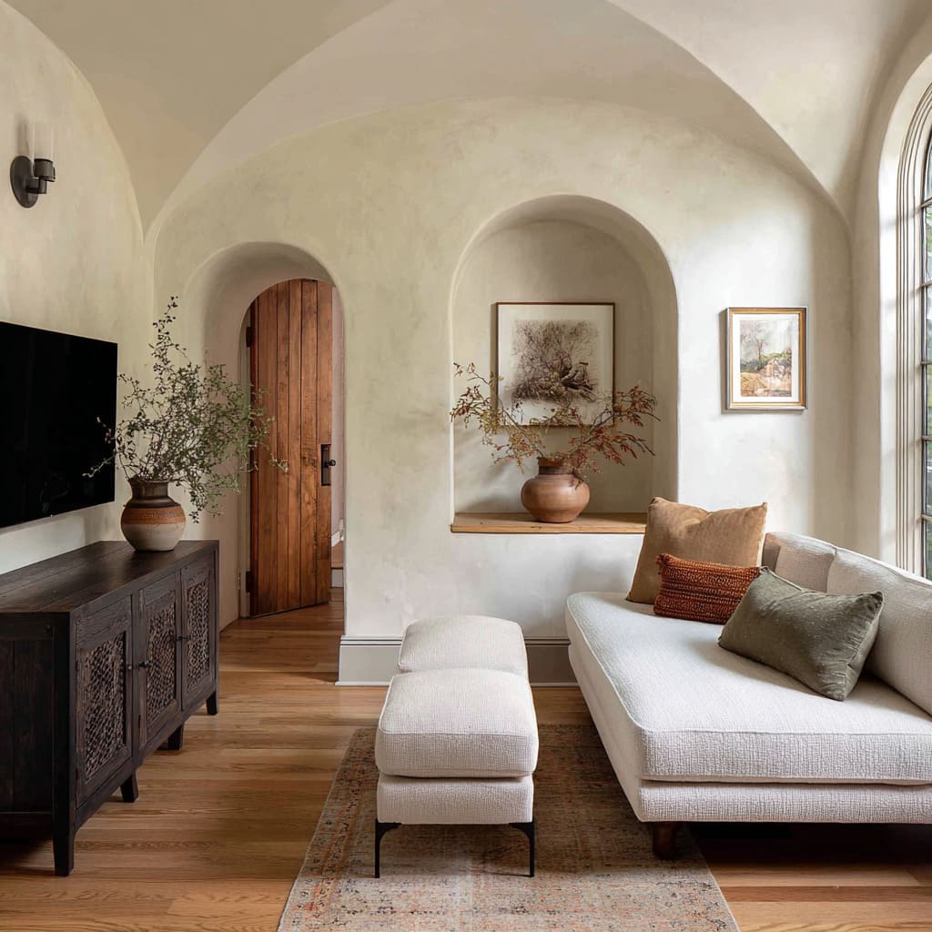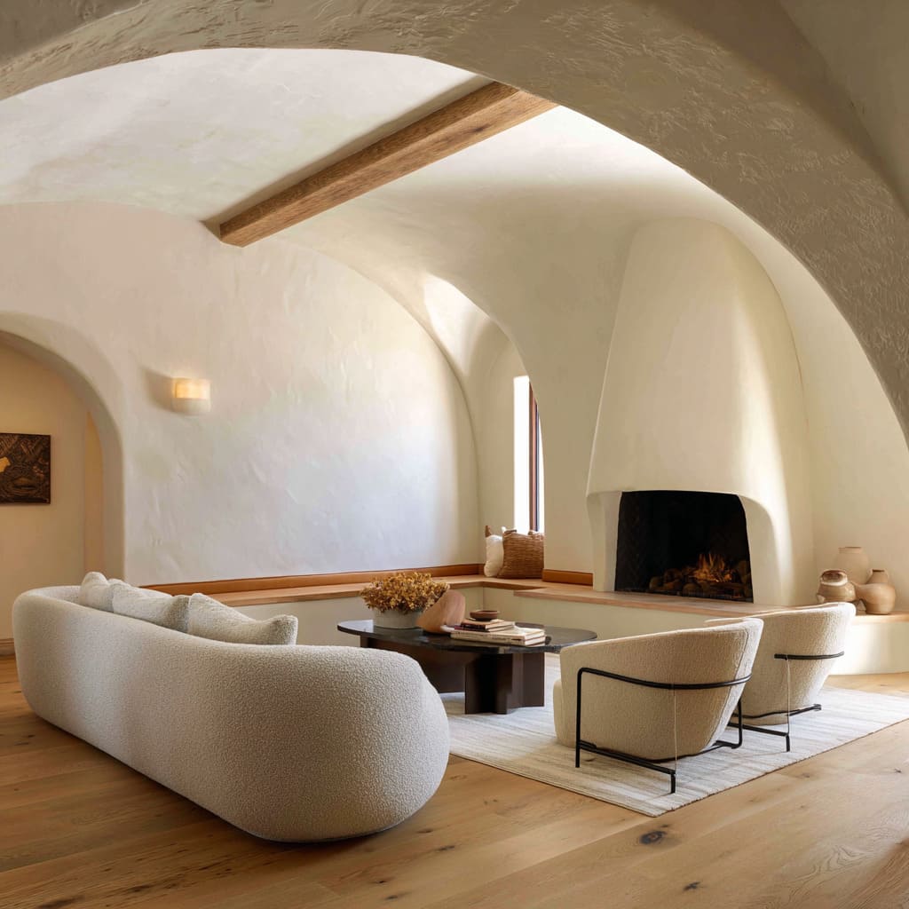 Una de las cualidades más fuertes del diseño interior colonial español moderno está en la forma en que paredes y techos se funden en una envolvente continua, casi esculpida, que se siente moldeada y no construida pieza por pieza. En lugar de la construcción tradicional en líneas rectas, las superficies se curvan suavemente unas hacia otras, creando transiciones delicadas donde la línea del techo se disuelve en curvas de muro sin encuentros duros.