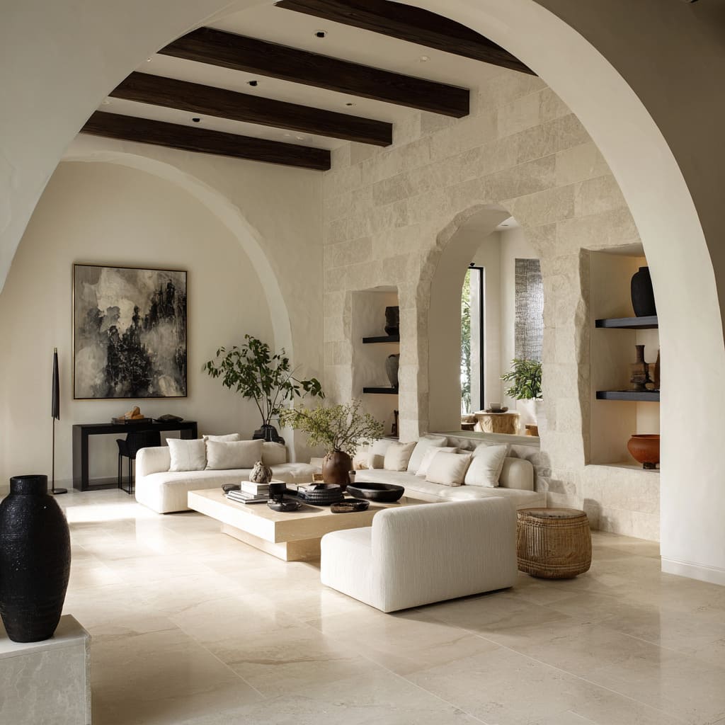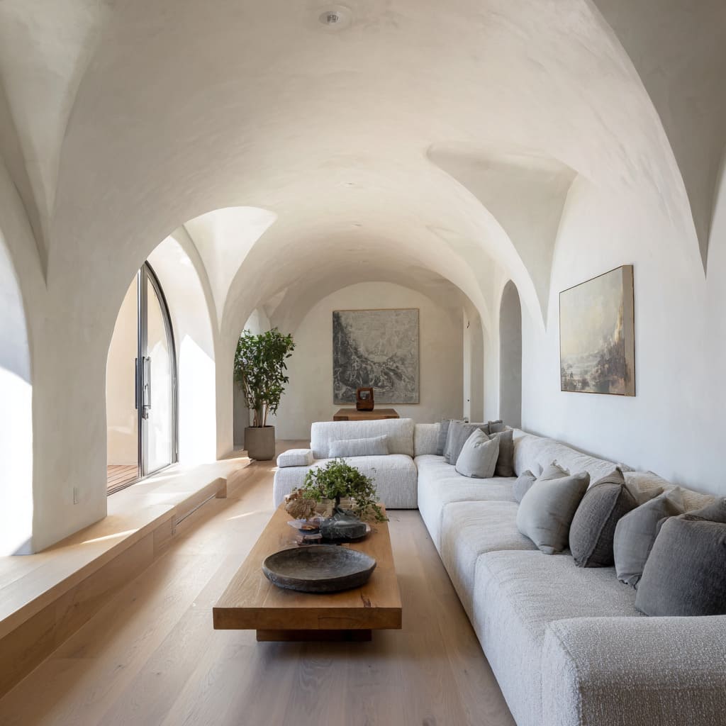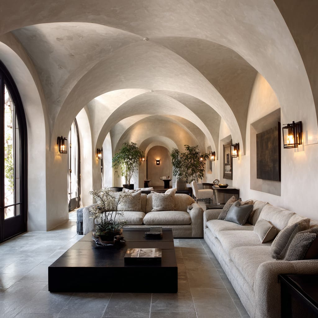 Los arcos no actúan simplemente como acentos en estos interiores: funcionan como señales espaciales repetidas que estructuran el diseño con un ritmo casi meditativo. Con frecuencia, las bóvedas recorren de manera continua la longitud del salón, variando levemente en ancho o curvatura.
