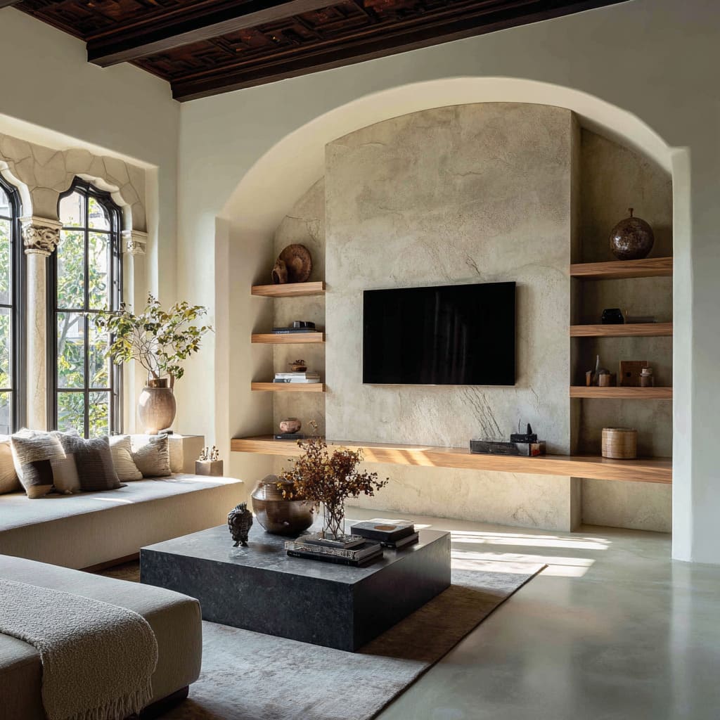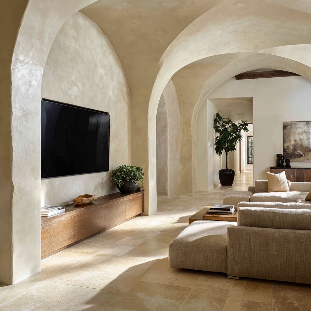 Televisores y muebles para medios se incorporan de forma que respetan la continuidad escultórica de los muros. Las pantallas pueden montarse enrasadas sobre superficies de yeso o encajarse en arcos poco profundos, de manera que pasen a formar parte de la arquitectura en vez de irrumpir como elementos tecnológicos invasivos.