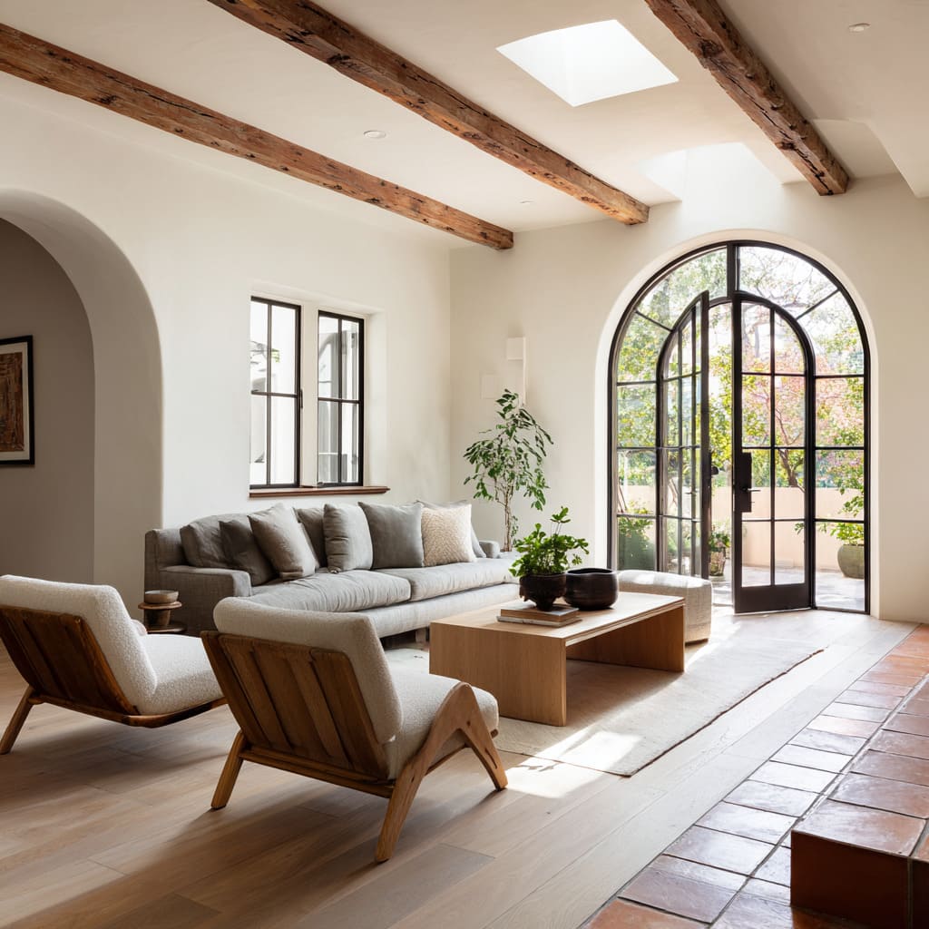 La conexión interior–exterior es un fundamento de este estilo. Grandes ventanas en arco, puertas de vidrio con perfilería de acero o huecos muy amplios se alinean con las vistas exteriores, convirtiendo la vegetación, las colinas o los patios en parte de la composición interior.