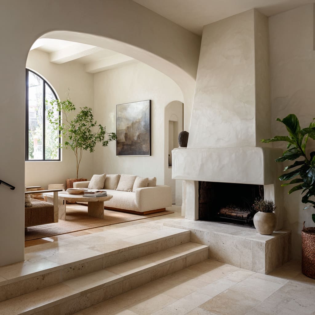Algunos diseños introducen azulejo o piedra con variaciones tonales muy sutiles, utilizando pequeños cambios de color y textura para aportar riqueza sin recurrir al estampado. El tratamiento global de la chimenea se relaciona estrechamente con la estética del diseño de interiores de estilo revival colonial español, donde el hogar es un centro simbólico; aquí, sin embargo, la forma se vuelve más serena, lisa y abstracta.