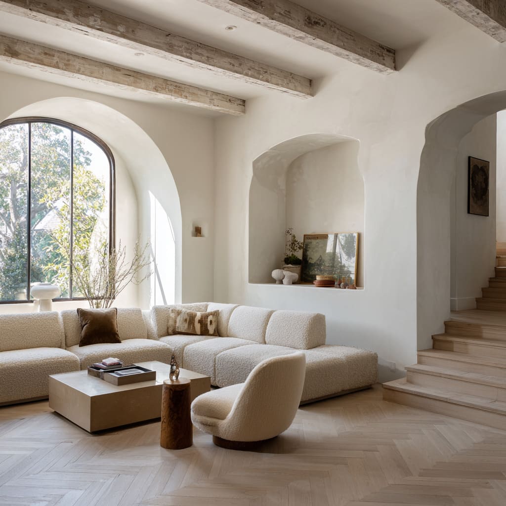 Estos arcos repetidos enlazan con la tradición del diseño de interiores de estilo revival colonial español, pero evitando la carga del detalle histórico literal. Su fuerza reside en la repetición, la proporción y el ritmo tranquilo que introducen en el ambiente doméstico.