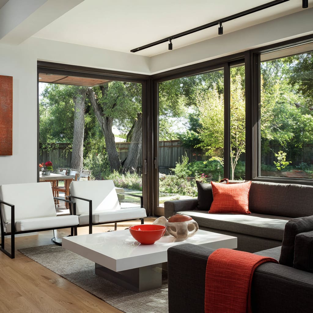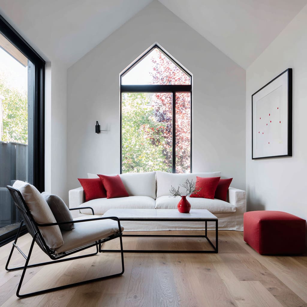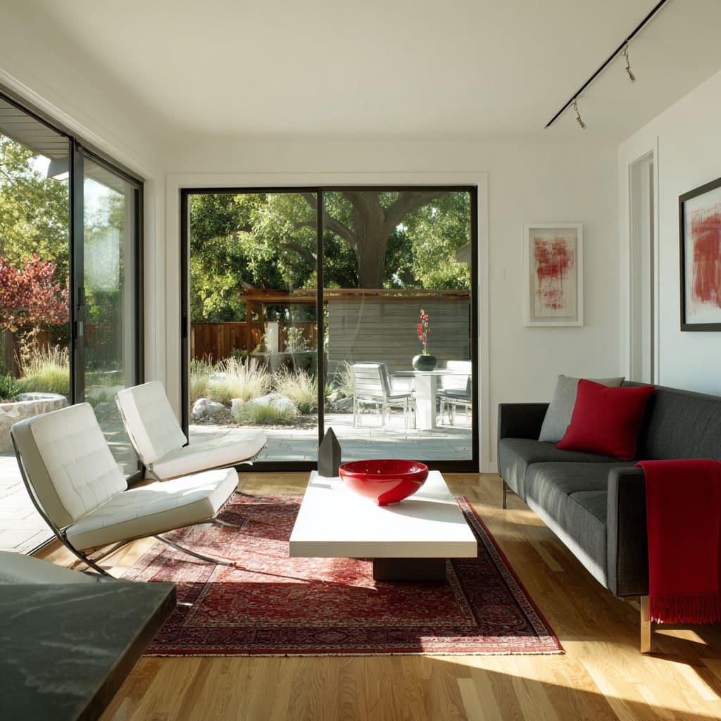 En diseños de salón en rojo, negro y blanco, la paleta suele inspirarse en los colores del exterior sin copiarlos de forma literal. El verde del paisaje se convierte en un fondo natural que hace que el rojo interior se perciba con más fuerza, mientras que la madera cálida de fuera se conecta de manera sutil con los suelos de madera interiores o las alfombras en tonos naturales.