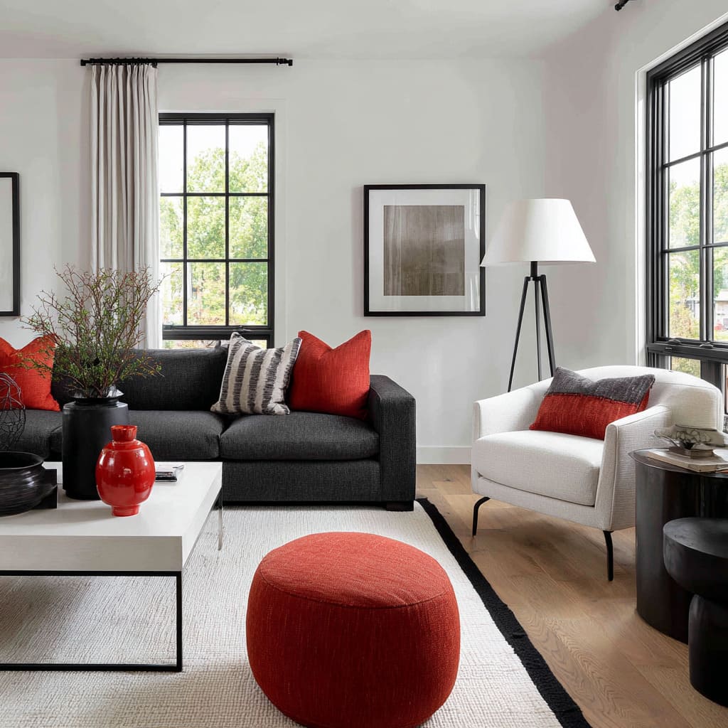 Idea para sala familiar con sofá carbón, cojines rojo ladrillo, puf rojo grueso, alfombra tejida color crema y sillas blancas de acento.