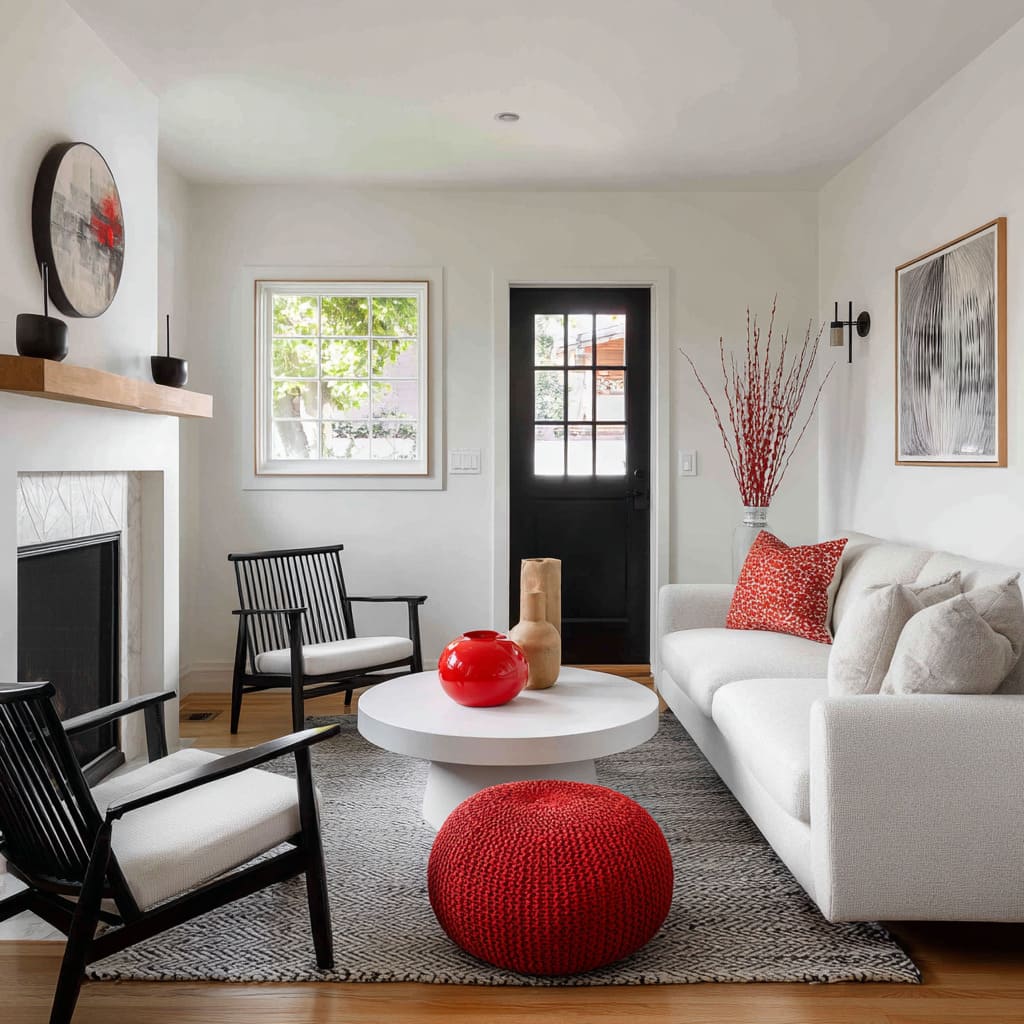 Concepto compacto de estilo bungalow con sofá blanco, puf rojo tejido, jarrón rojo brillante y sillas negras de acento.