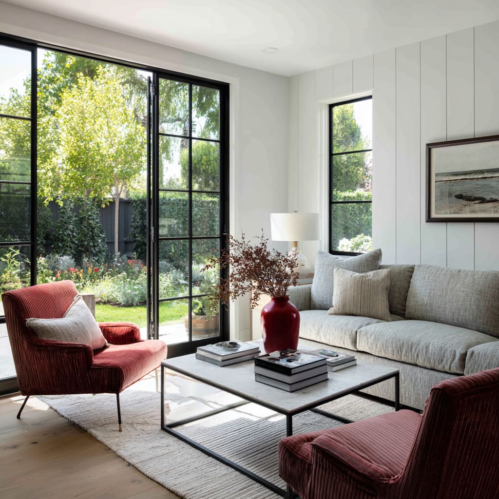 Propuesta acogedora con sillones rojos acanalados, sofá gris claro, ventanas con marco negro, mesa de centro de piedra delgada y jarrón rojo mate con ramas.