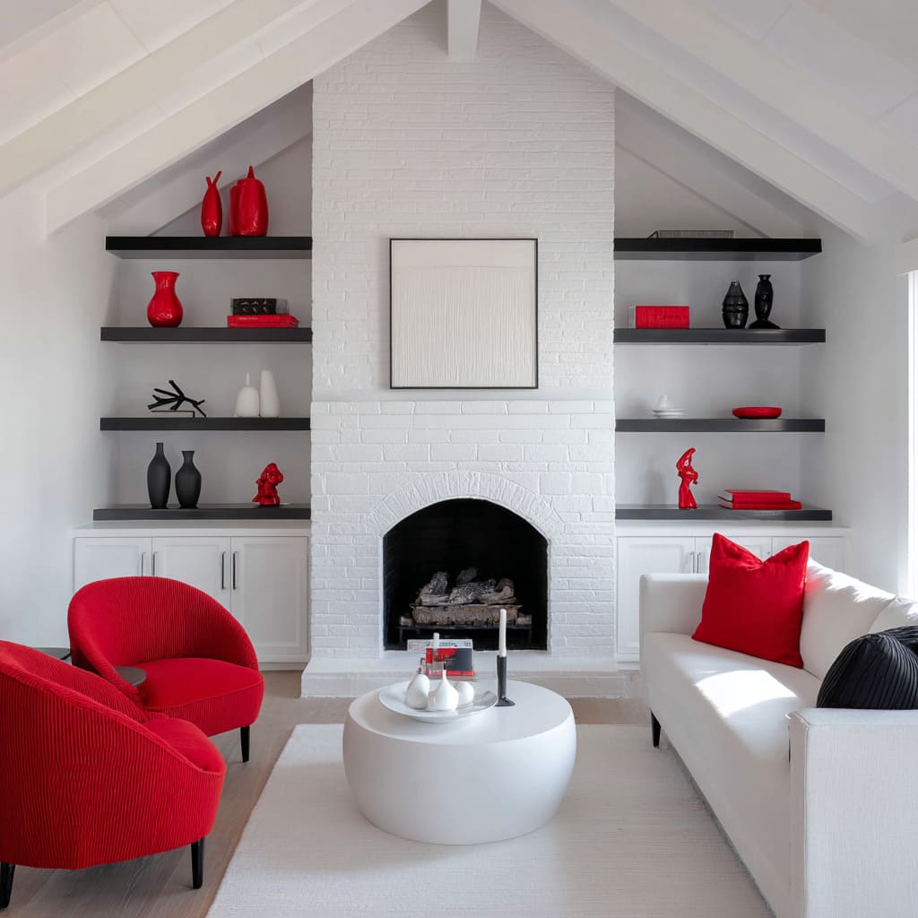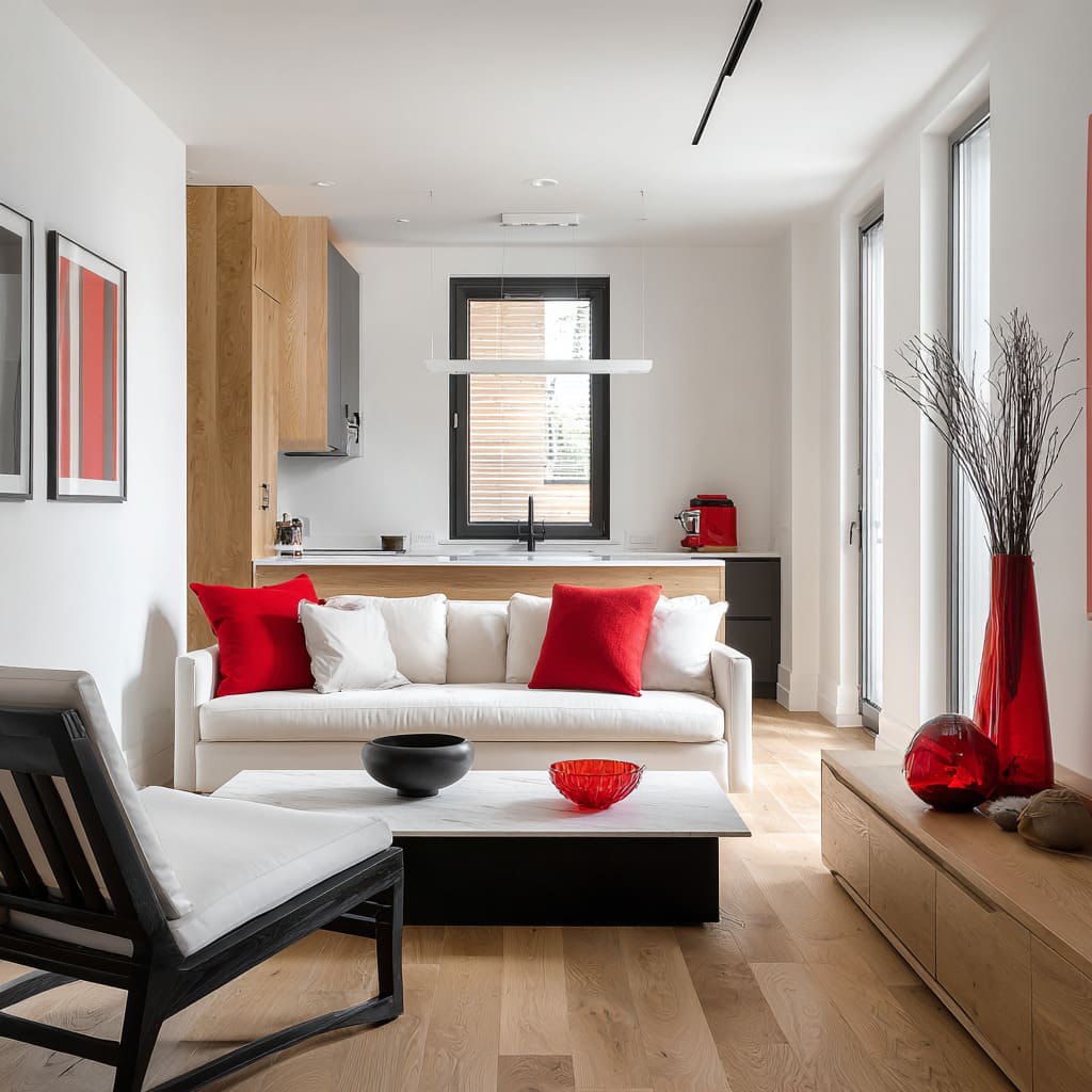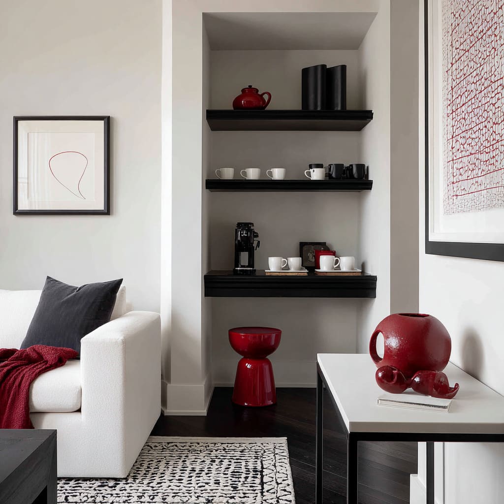 Esta variedad demuestra cómo las ideas de salón en negro, rojo y blanco pueden ir de la suavidad a la estructura simplemente ajustando los materiales y el ritmo espacial.