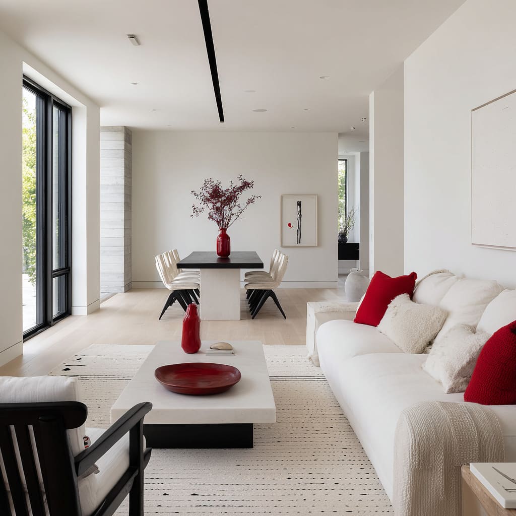 En estancias abiertas, el rojo suele actuar como referencia principal, el negro como estructura que define las zonas y el blanco como volumen que mantiene todo luminoso y equilibrado.