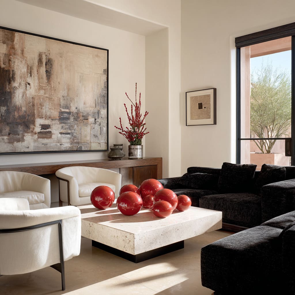4. Sala moderna en rojo, negro y blanco con mesa de centro cuadrada de piedra clara, esferas rojas brillantes y sofá modular negro.