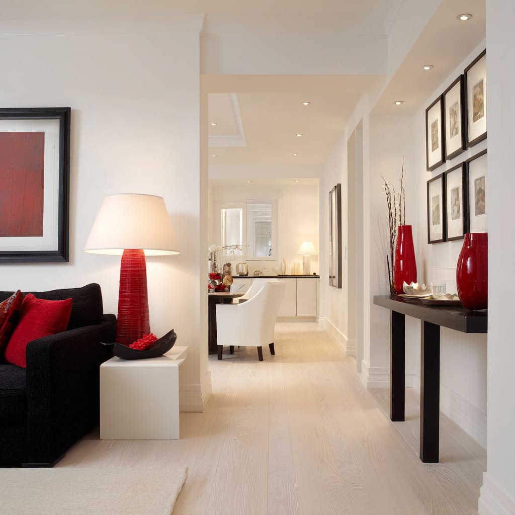 7. Ideas para estilizar una sala estrecha en rojo, negro y blanco con sofá carbón, cojines y lámpara rojos, y consola negra delgada con detalles rojos.