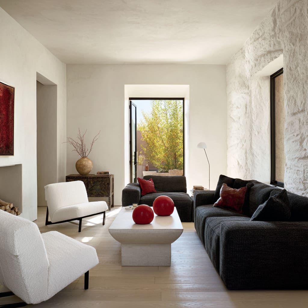 Incluso limitándose a rojo, blanco y negro, el clima de una estancia cambia por completo según la textura, la escala y el acabado. Algunos interiores se inclinan hacia una sencillez bañada por el sol, usando maderas suaves, grises antracita mate y piedra desgastada para crear fondos tranquilos donde el rojo aparece como un signo escultórico.