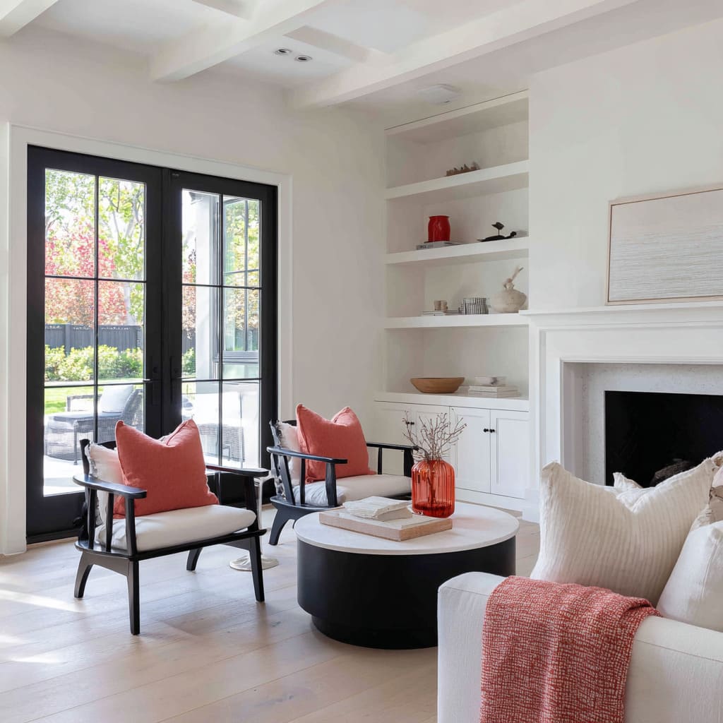 Sala familiar suave en rojo, negro y blanco con techo artesonado, sillas negras de acento, manta coral y mesa de centro redonda bicolor.