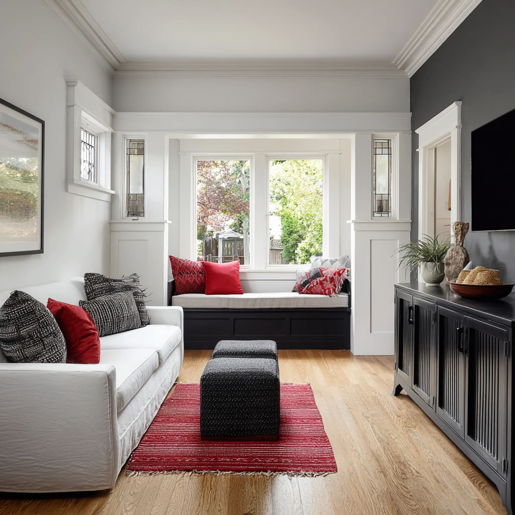 Sala tradicional con sofá blanco, cojines rojos y negros, banco integrado bajo la ventana en negro y alfombra roja con estampado.