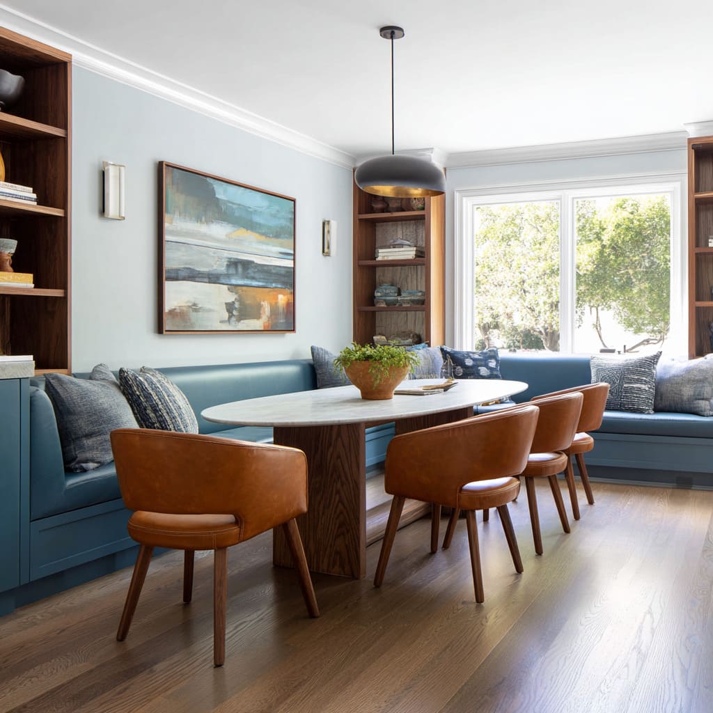 banqueta empotrada en U azul verdoso con mesa ovalada y sillas de comedor en cuero cálido