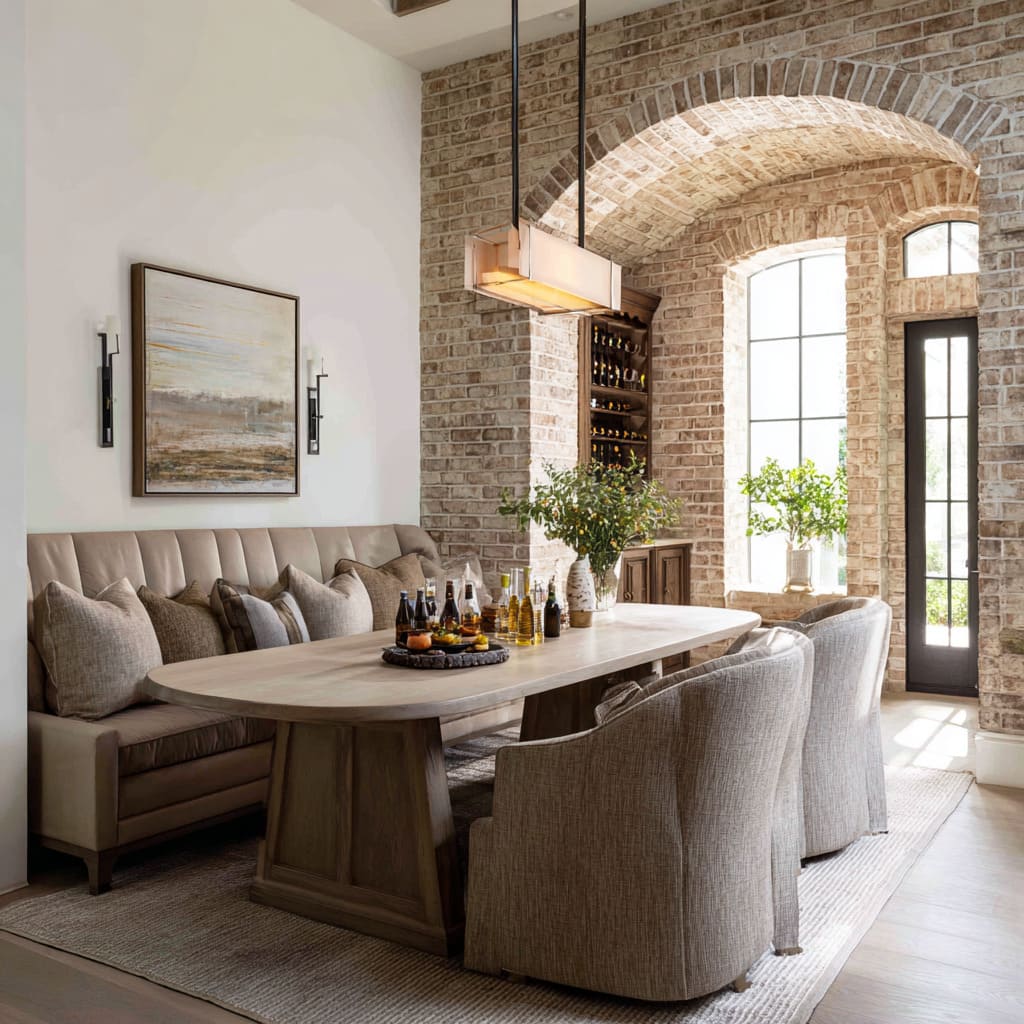 concepto de comedor lounge con arco de ladrillo tipo bóveda, banqueta larga, sillas suaves y colgante rectangular