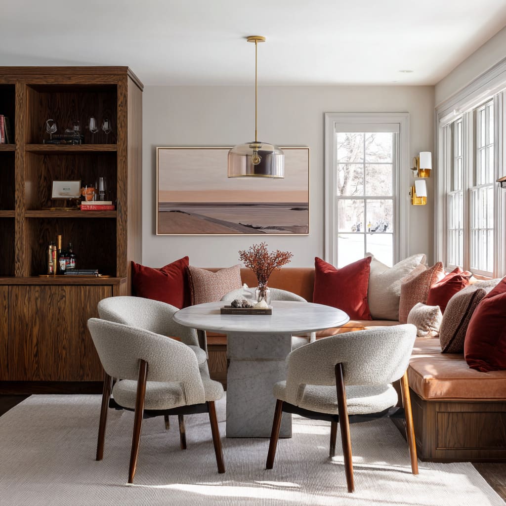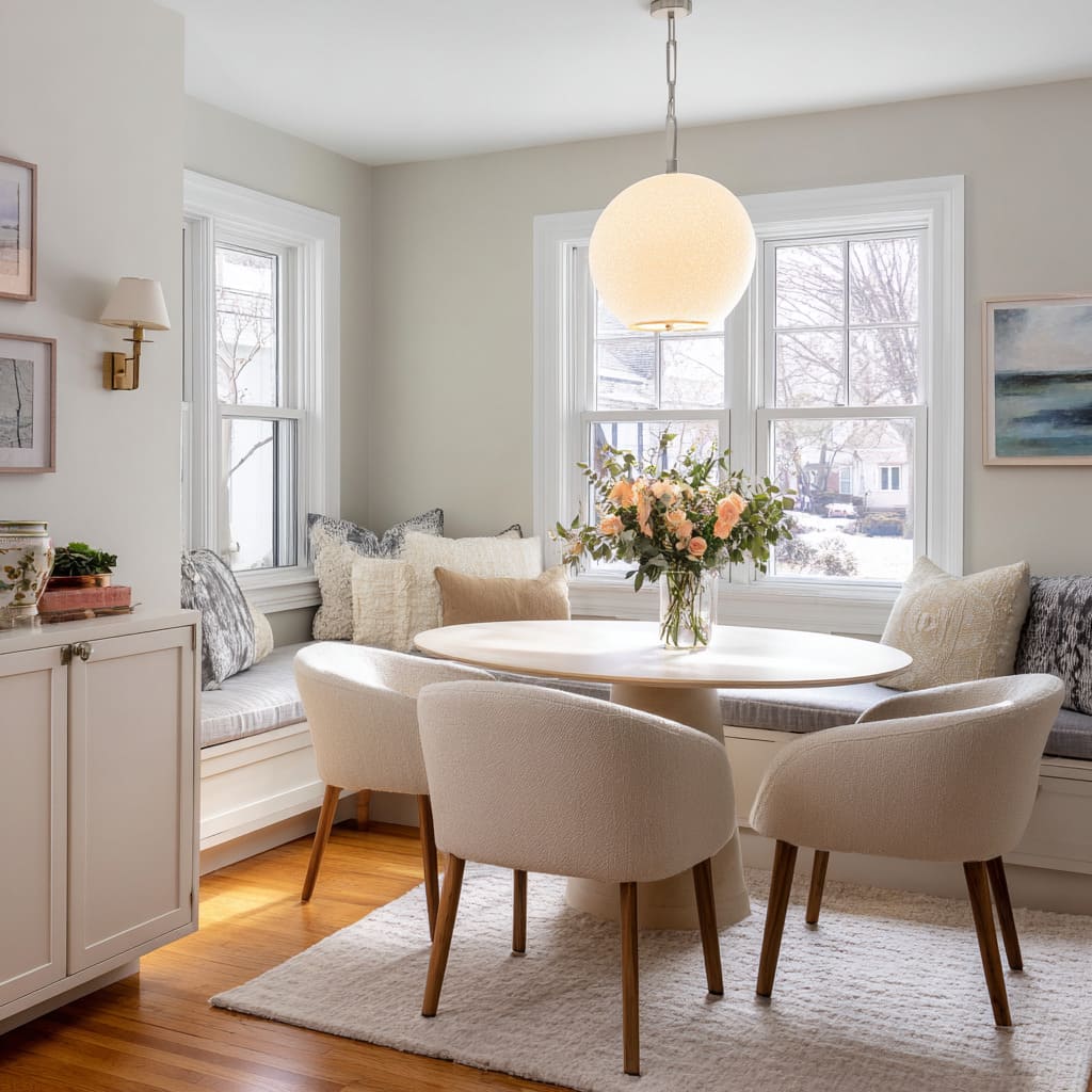 rincón de desayuno luminoso con banco envolvente, mesa redonda con pedestal y colgante globo