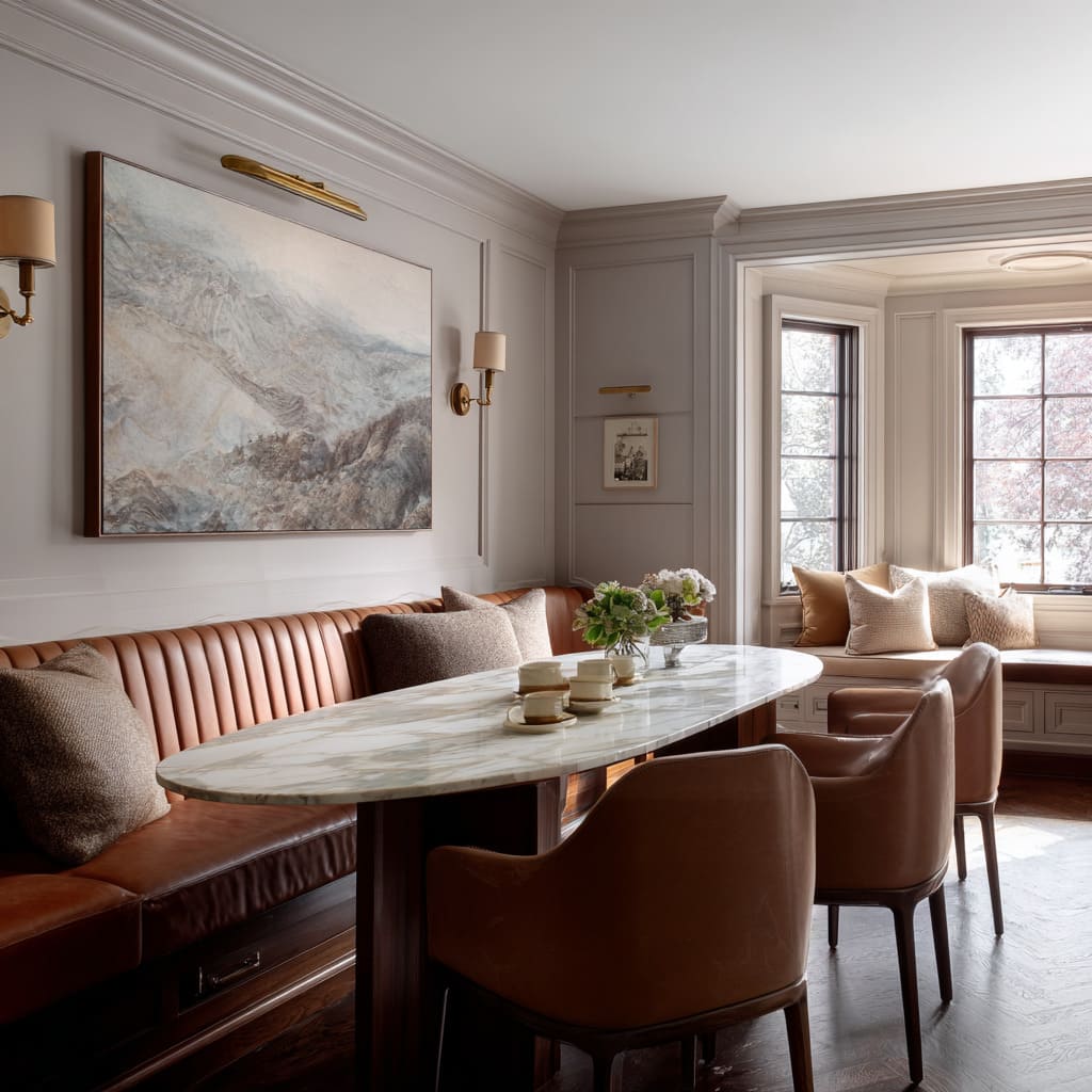 comedor estilo georgiano con banqueta de cuero coñac con canalé y mesa ovalada de piedra