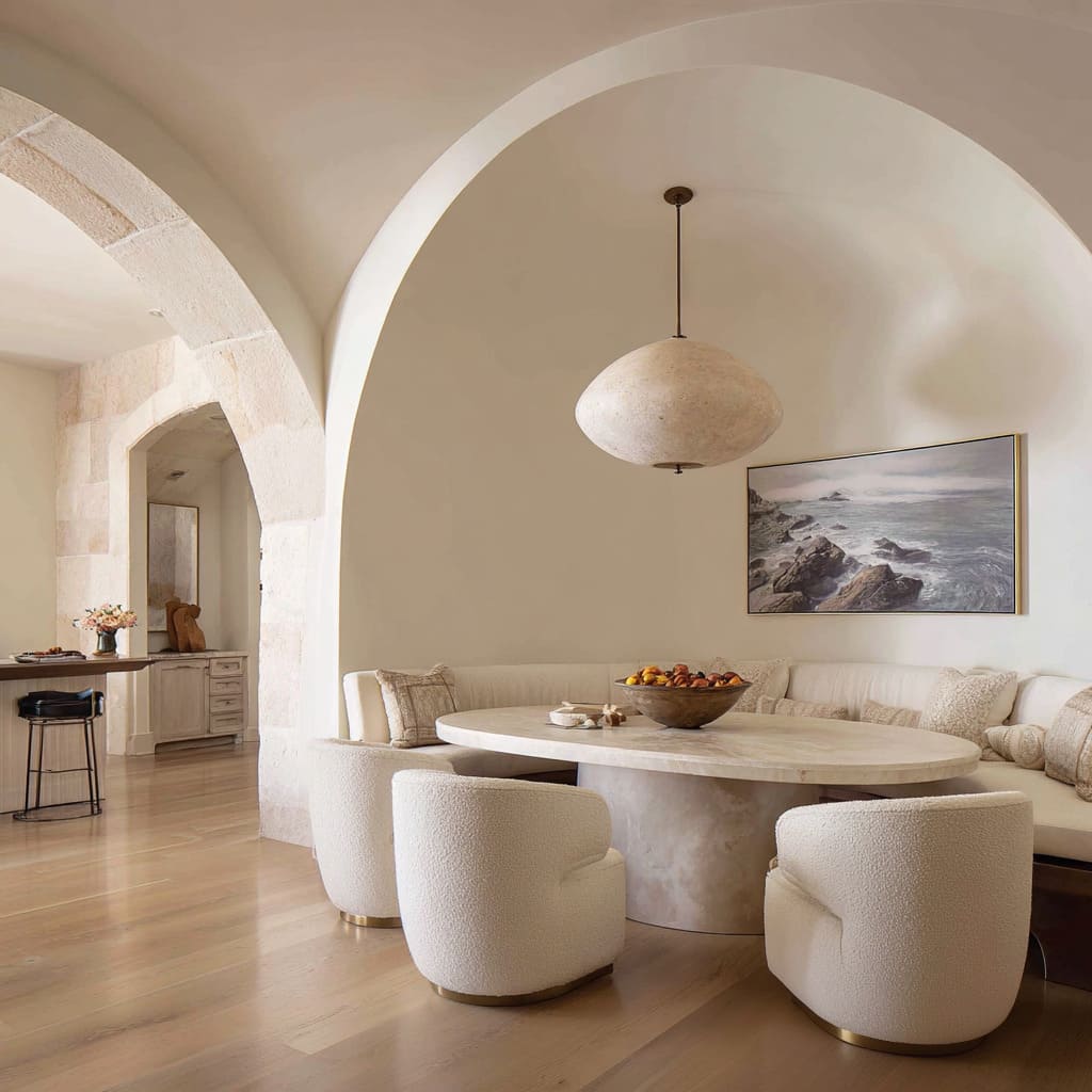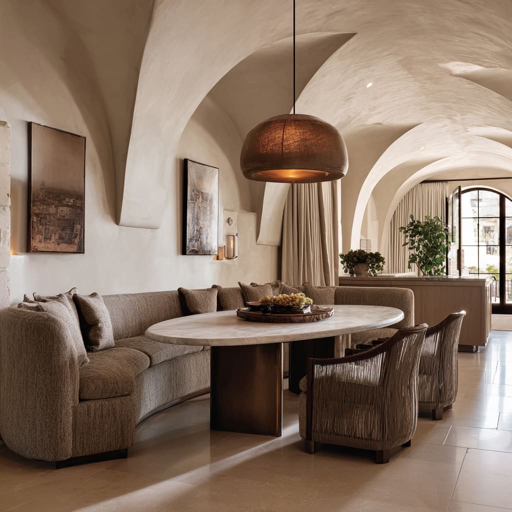 banqueta tipo sofá curvo bajo arcos de yeso con mesa de comedor ovalada de piedra con pedestal