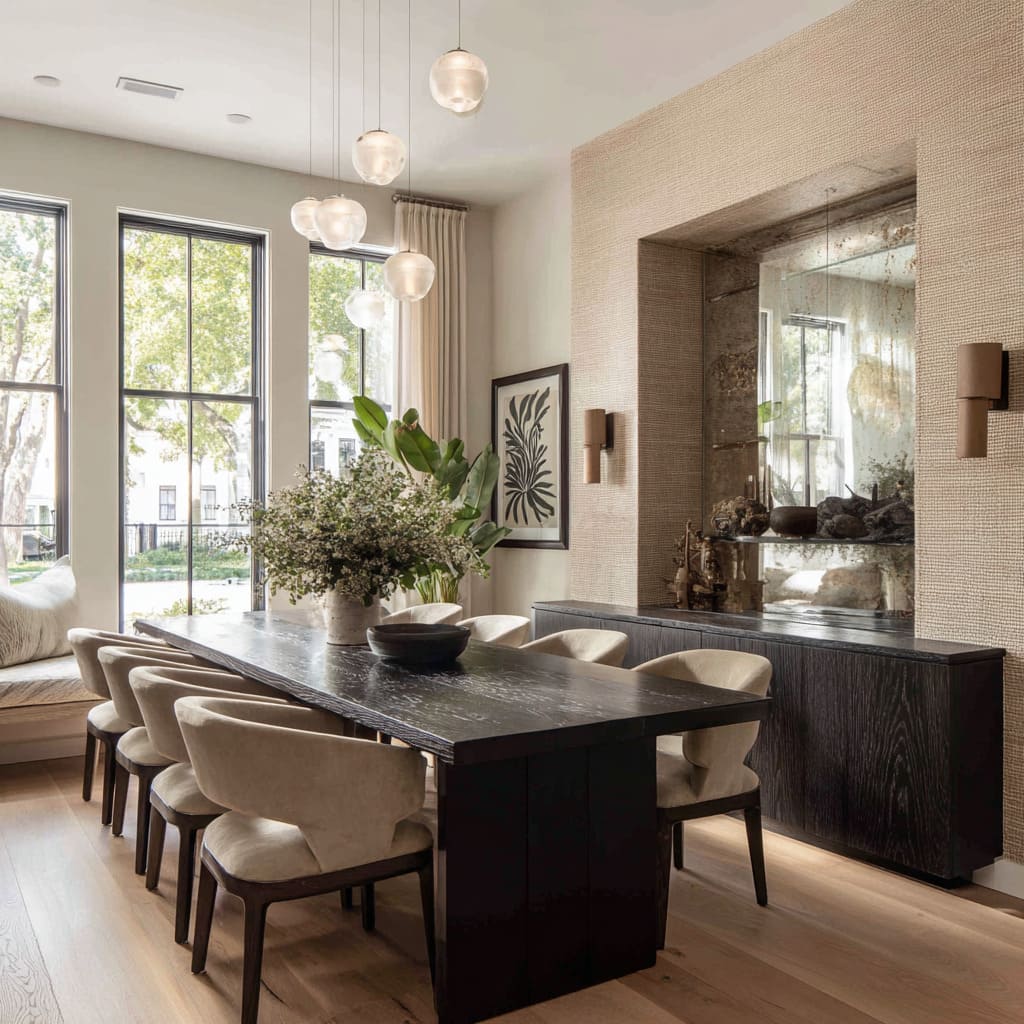 mesa de comedor oscura con sillas tapizadas redondeadas, luces globo de vidrio y nicho espejado
