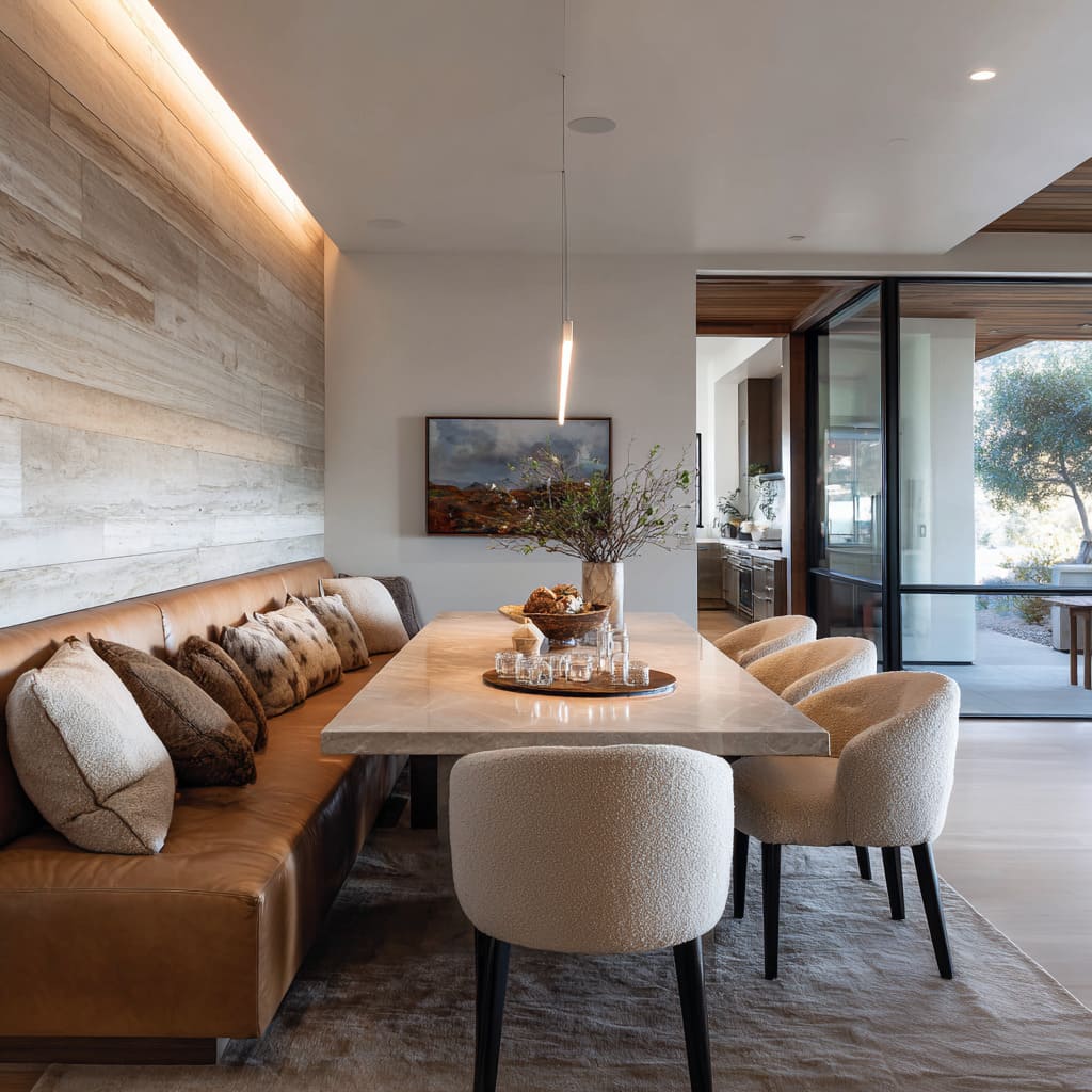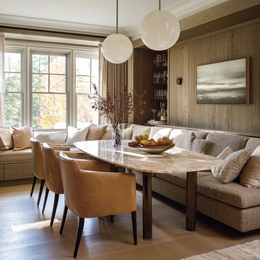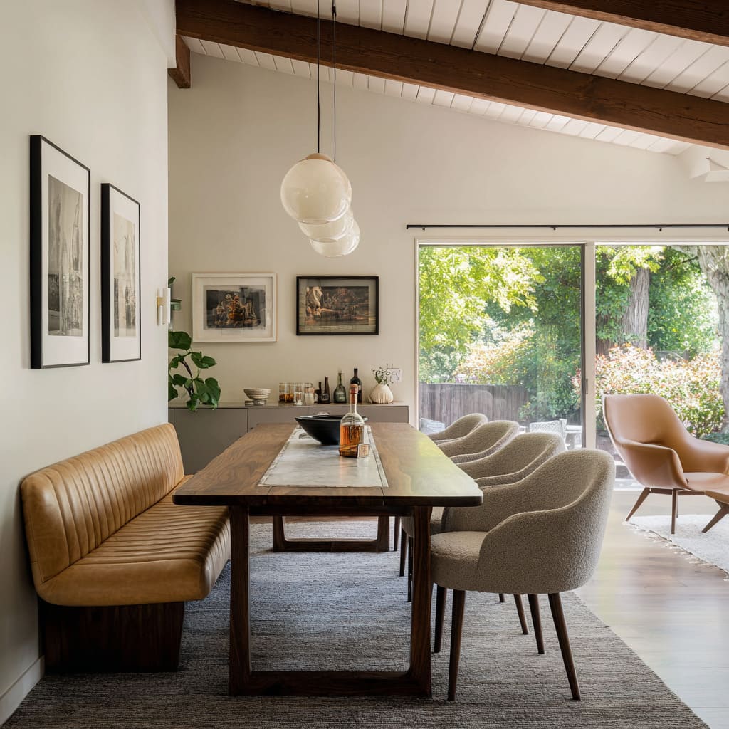 Por eso tantas lounge dining room design ideas fuertes se apoyan en una banqueta que funciona como un sofá y no como un banco fino. El detalle que suele pasarse por alto no es “banqueta vs sillas”, sino la altura y la suavidad del respaldo de la banqueta: