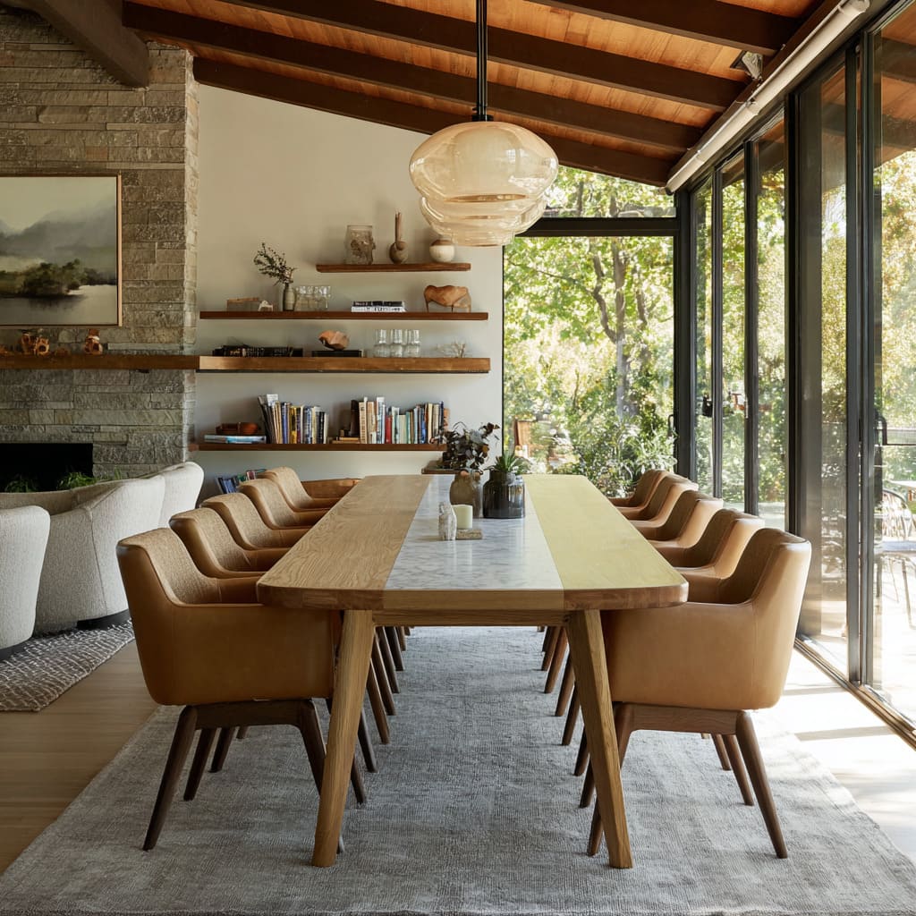 • Incluso mesas rectangulares largas pueden leerse lounge si los extremos se suavizan o si el asiento incluye una banqueta que convierte un lado en un borde continuo tipo “sofá”, haciendo que el conjunto se sienta menos como una cuadrícula formal.