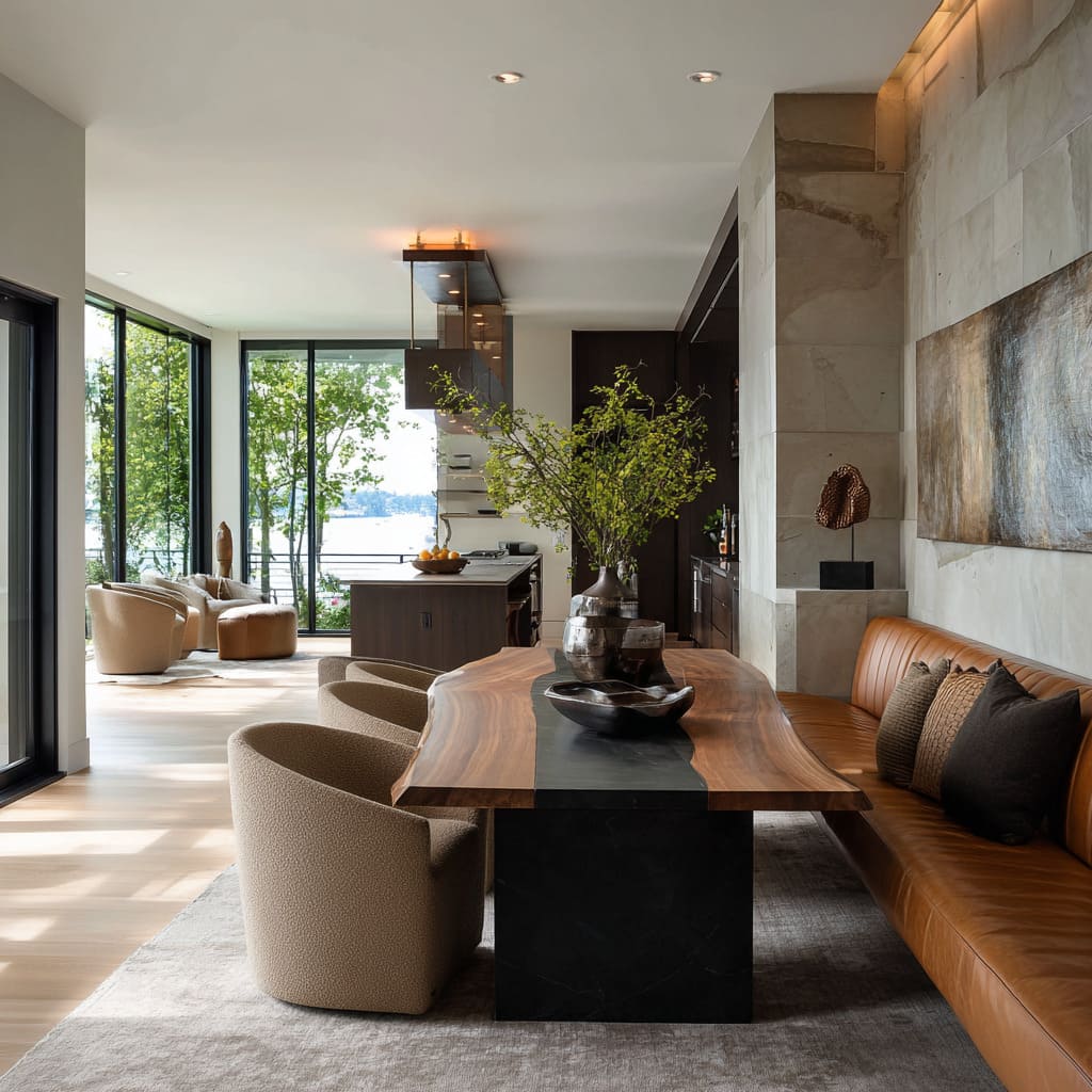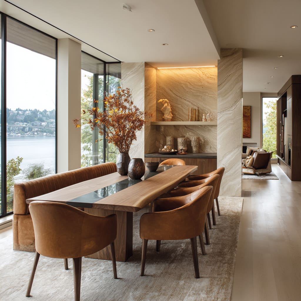 zona de comedor moderna con vista al lago, banqueta de cuero y nicho de pared de piedra iluminado
