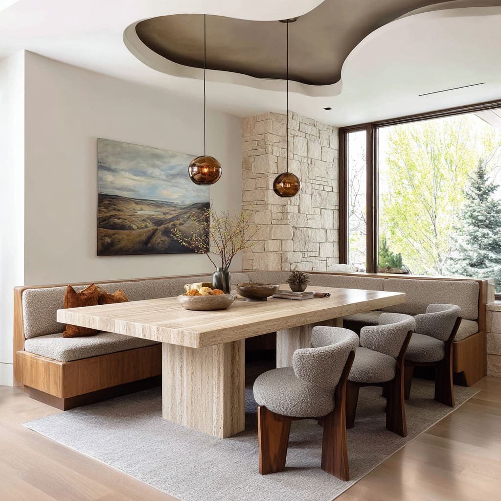 comedor lounge de planta abierta con hueco escultural en el techo, banqueta en L y mesa de piedra